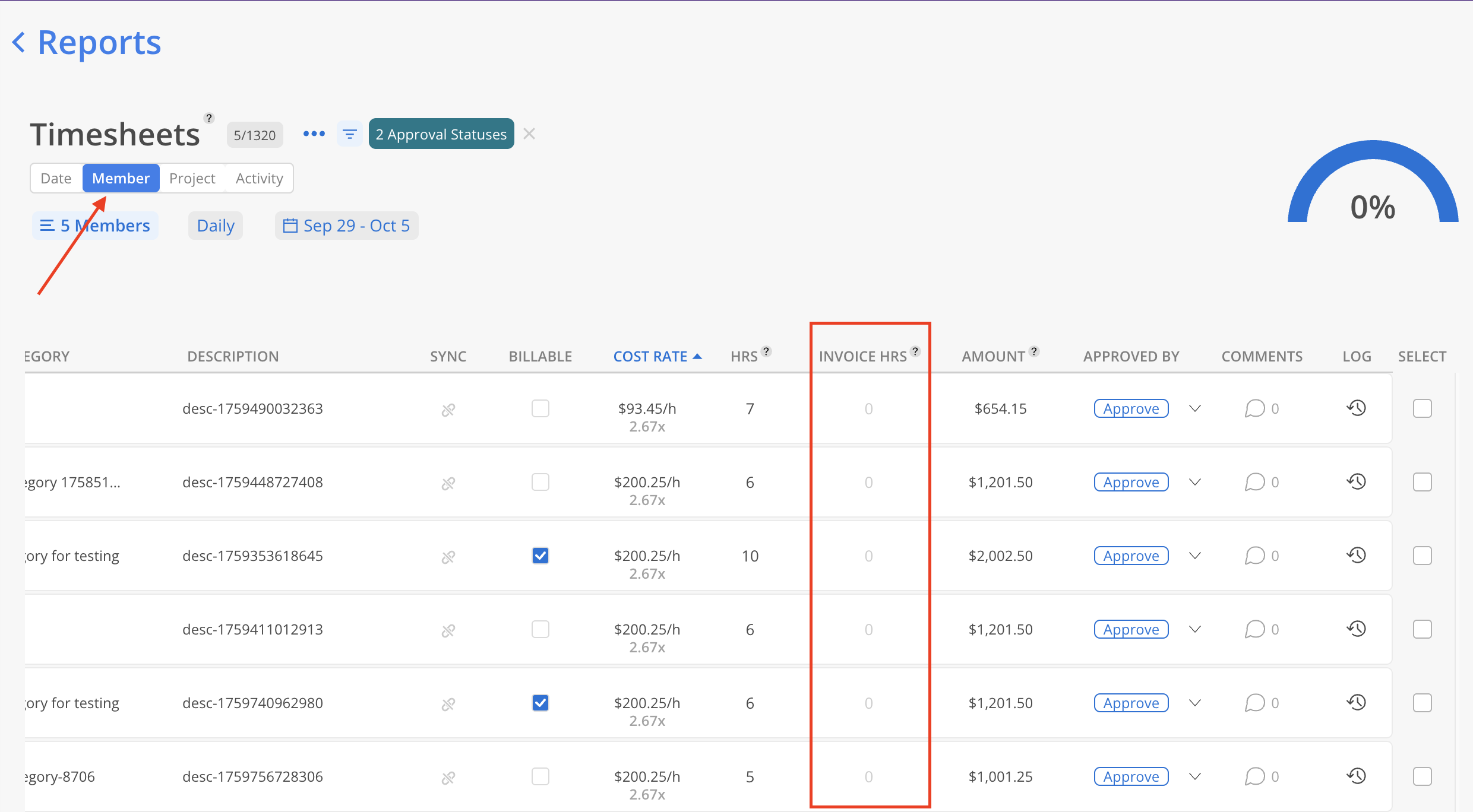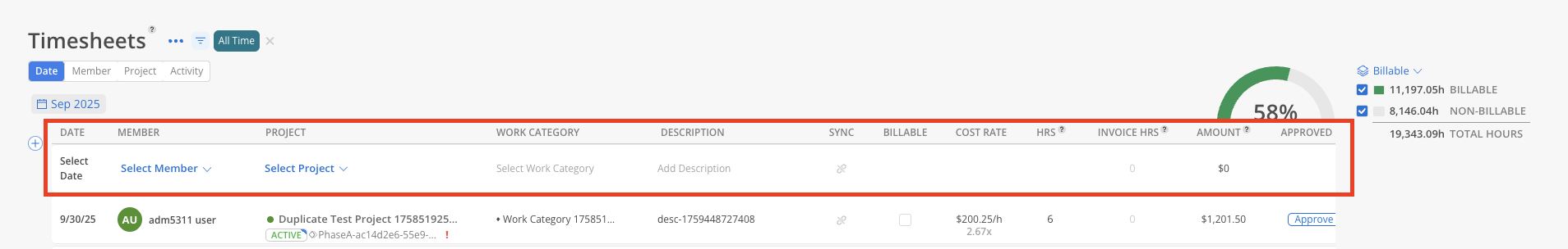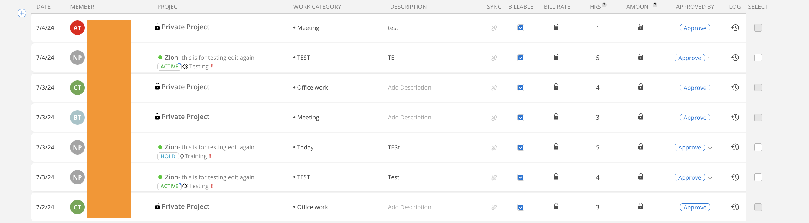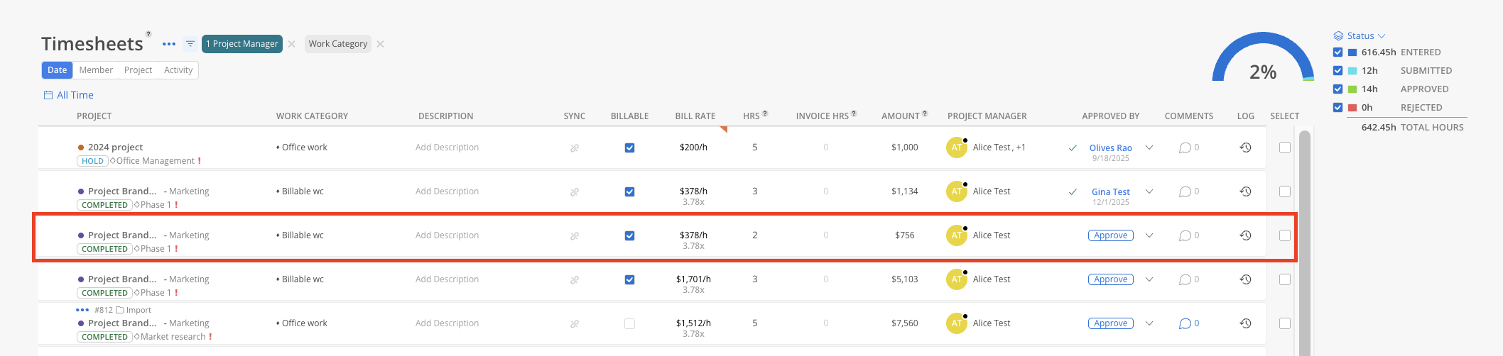 To modify single timesheets, click directly on fields such as date, member, project, work category, description, billable status, rate, hours, or approve/reject to edit them.
