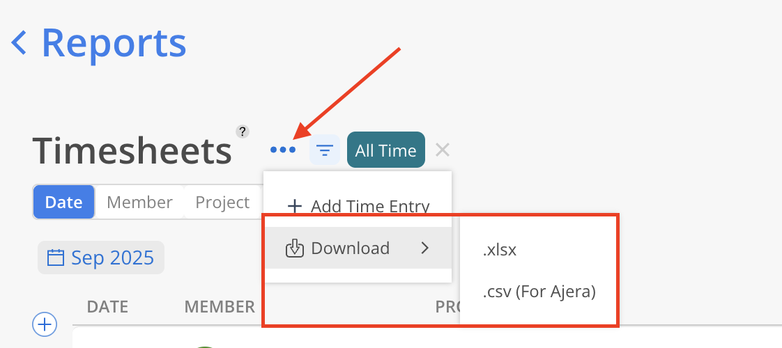 All tabs of the Timesheets Report can be downloaded by clicking the three dots located to the right of the report name on the top of the page.
