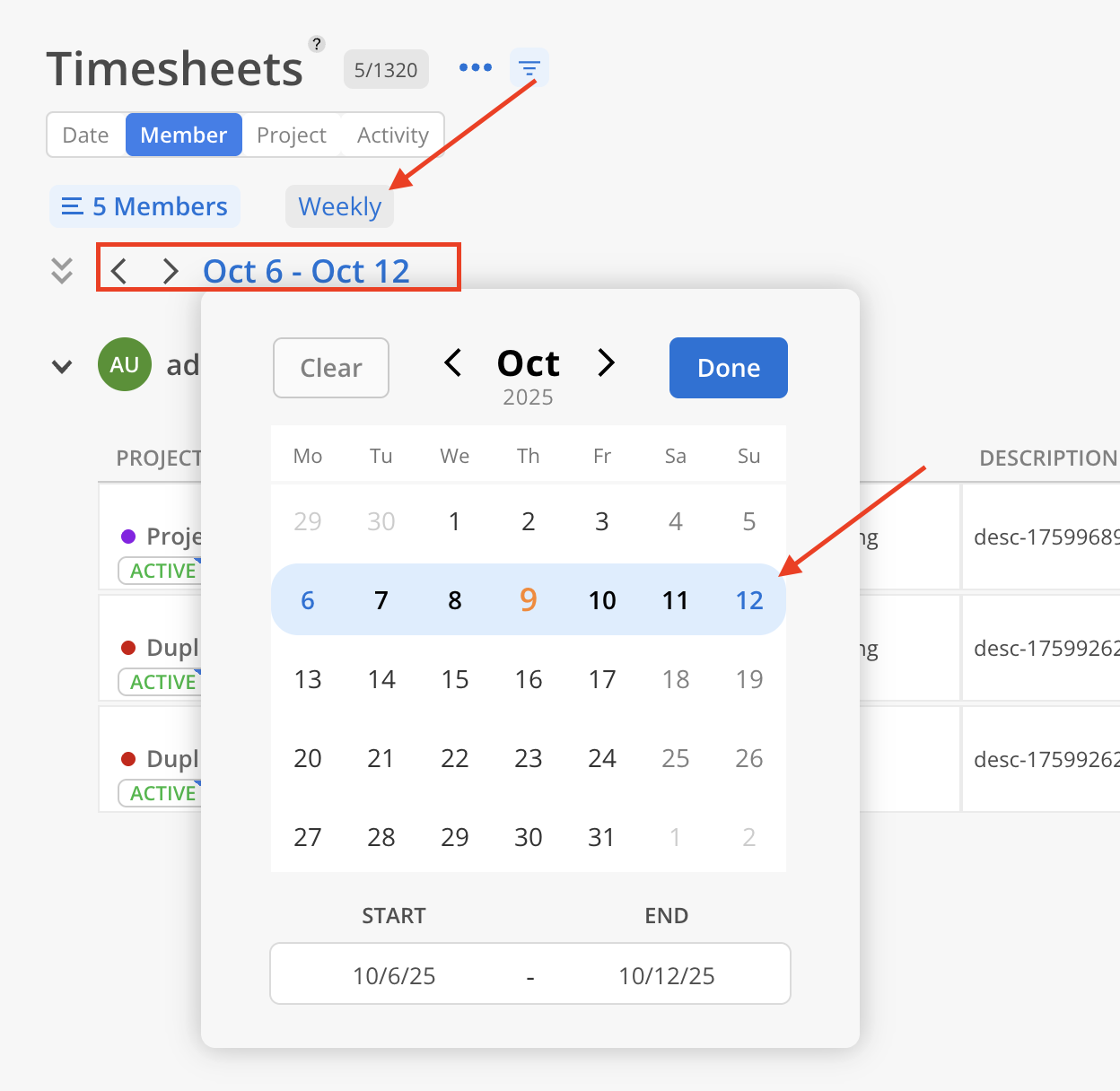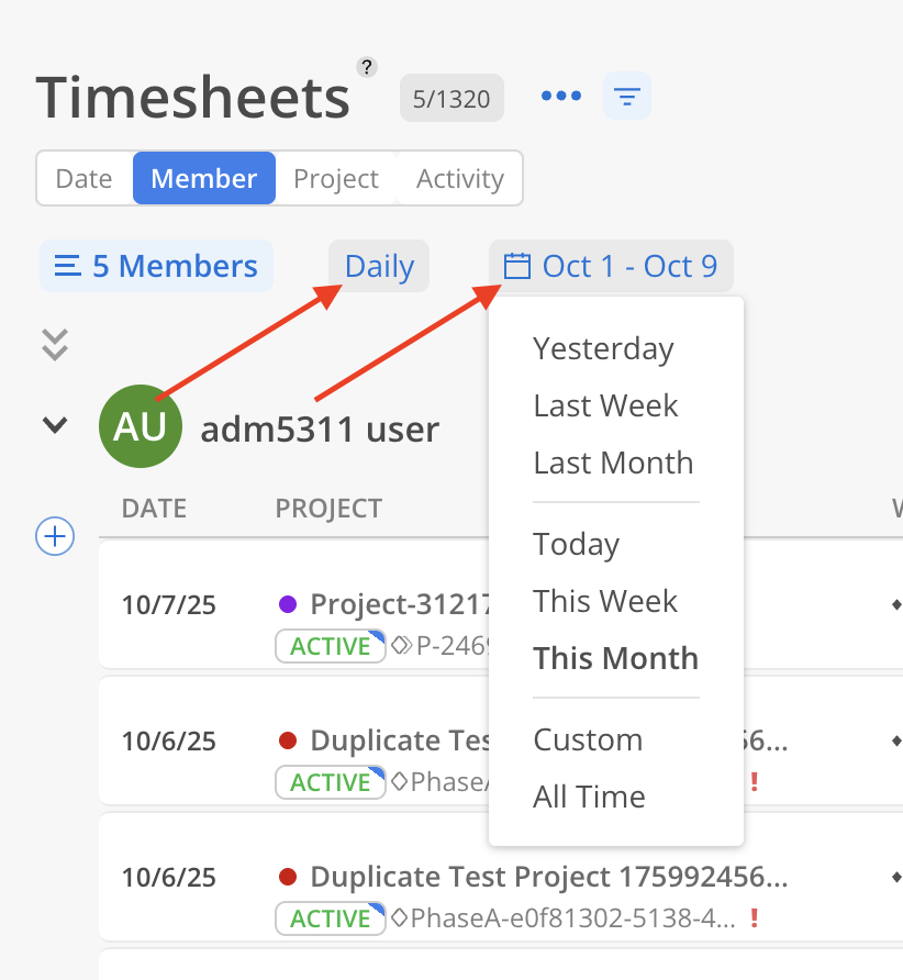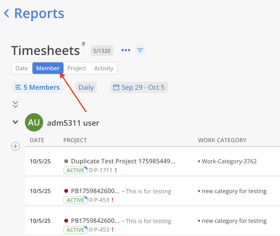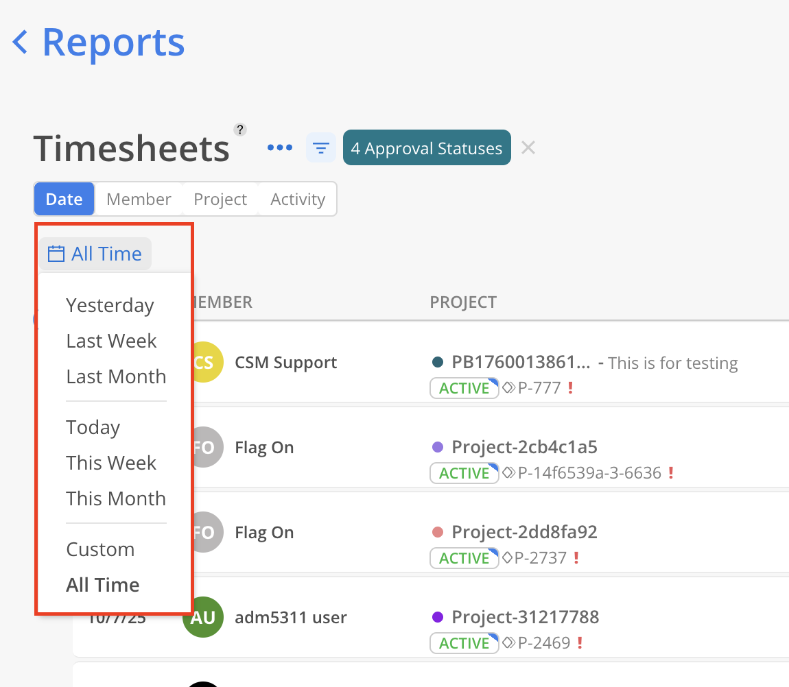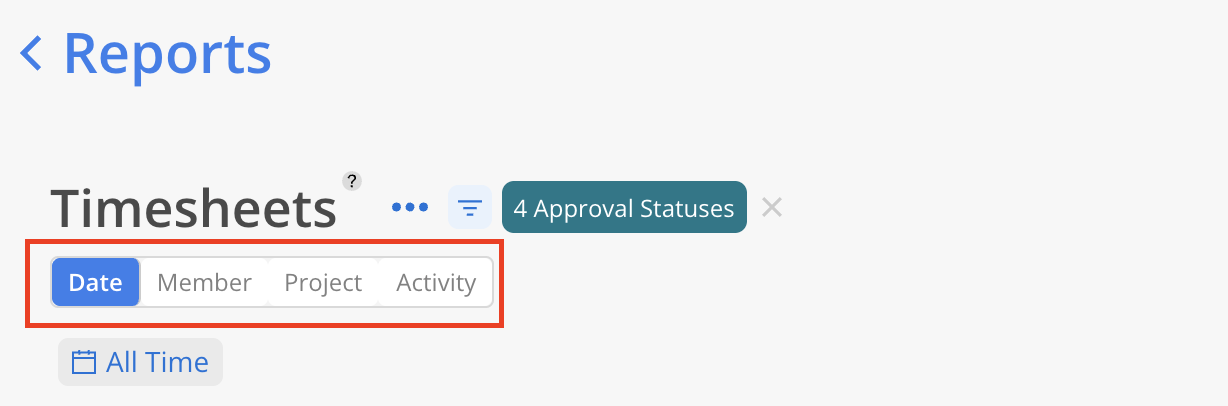 The report can be viewed by Date, Member, Project, or Activity. All applied filters, selected Members, selected Projects, date range, sorting option, and view settings will be automatically saved with the report.