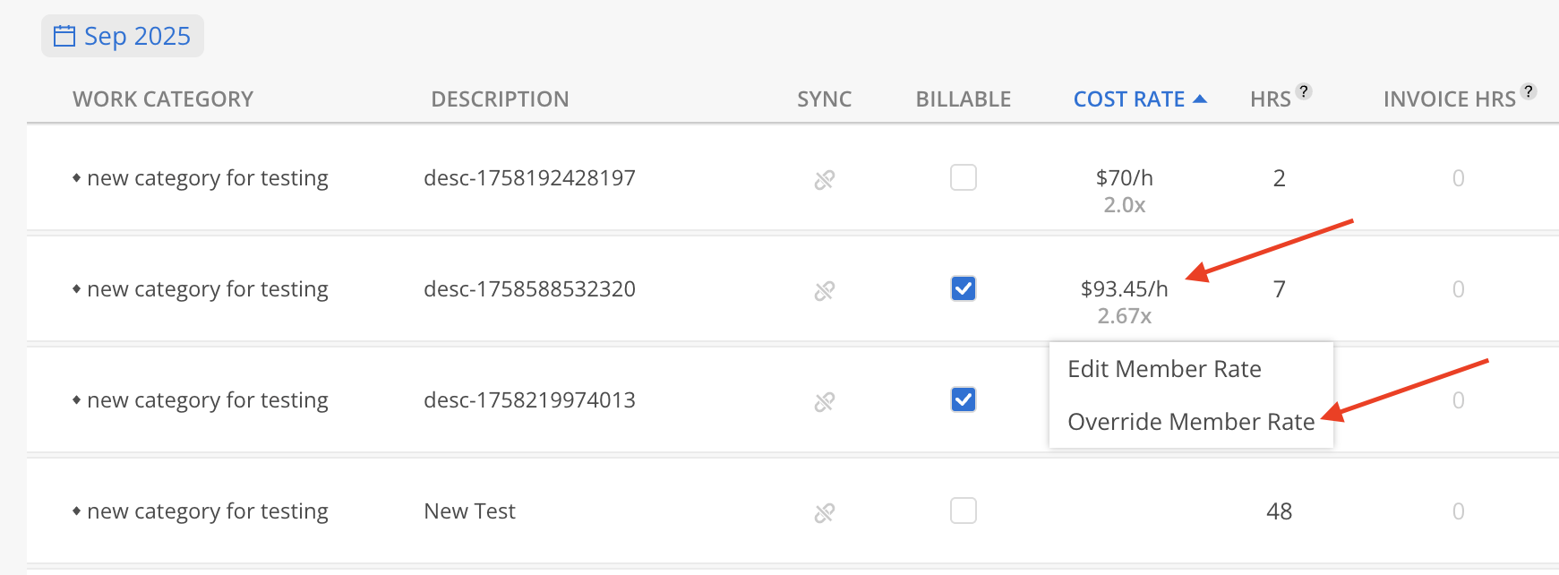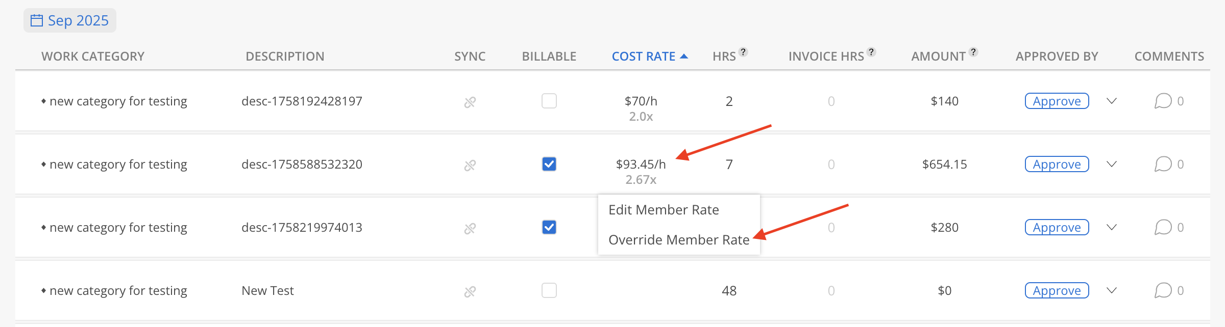 Click the Rate value in the Timesheet that needs to be overridden. Select Override Member Rate from the available options.