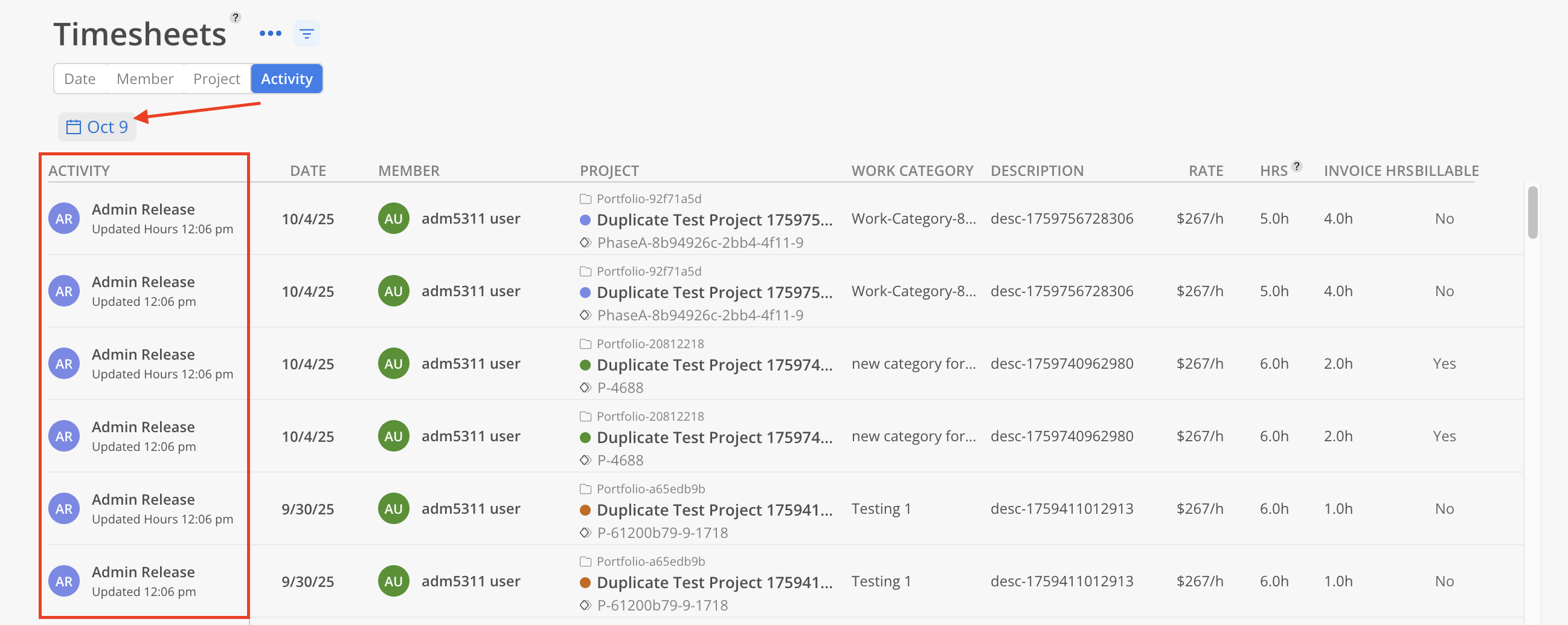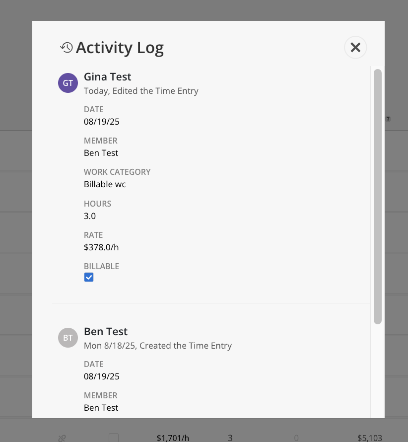 Similar to the Timesheet log, the Activity tab displays a record of changes. The Activity column on the left shows which Member made changes to the Timesheet and when, while the Timesheet details are displayed on the right.