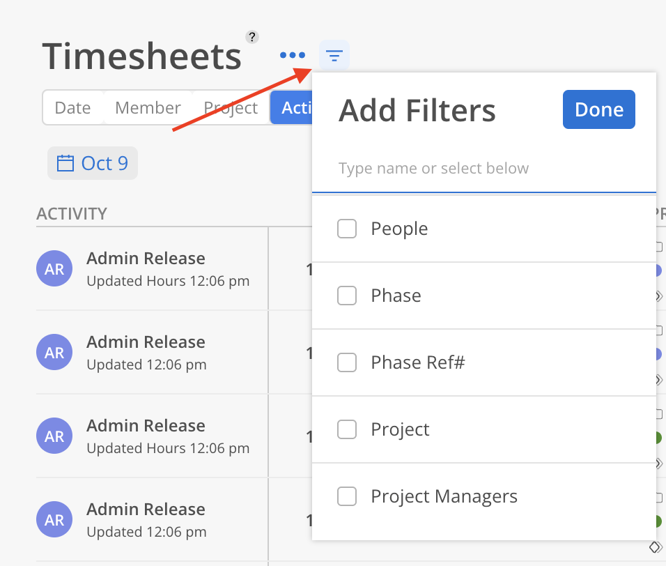 Click the filter icon to filter activities by Members, Phases, Projects, and Projects where a Member is the Project Manager.