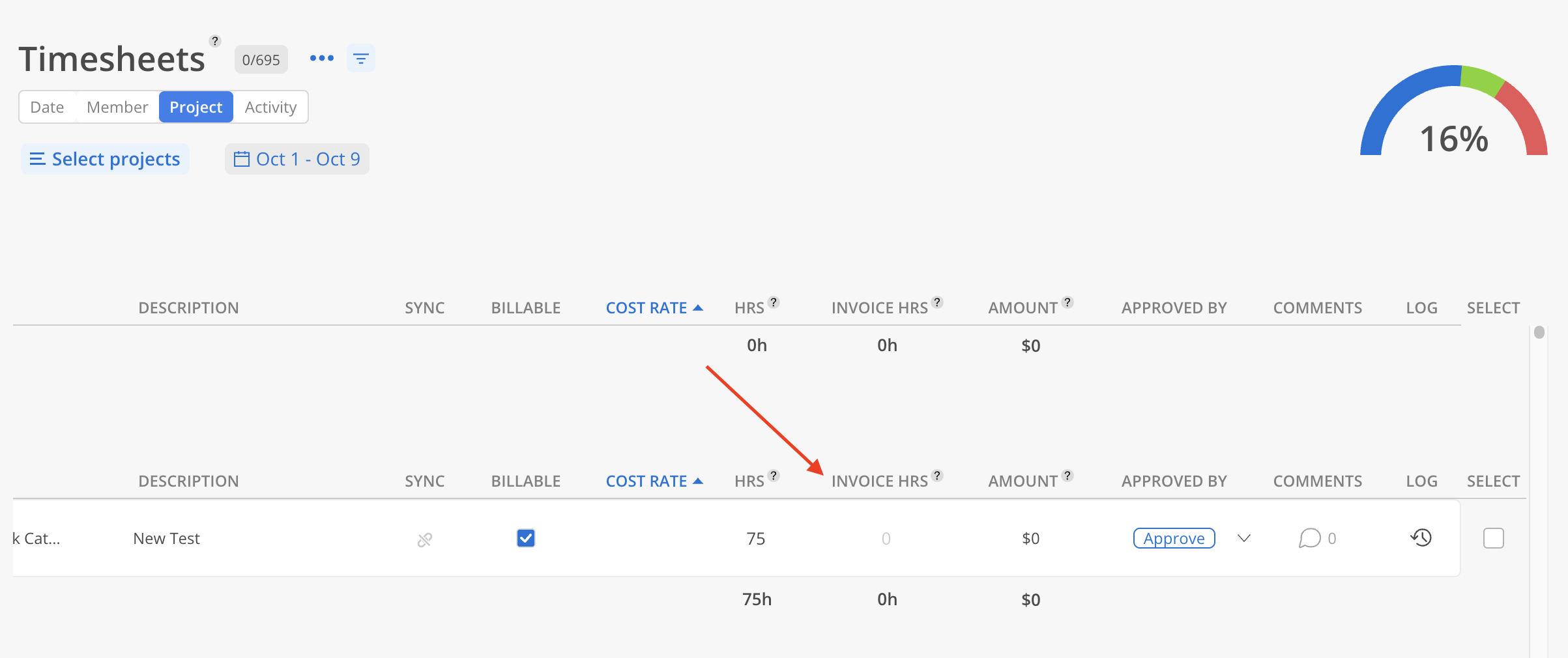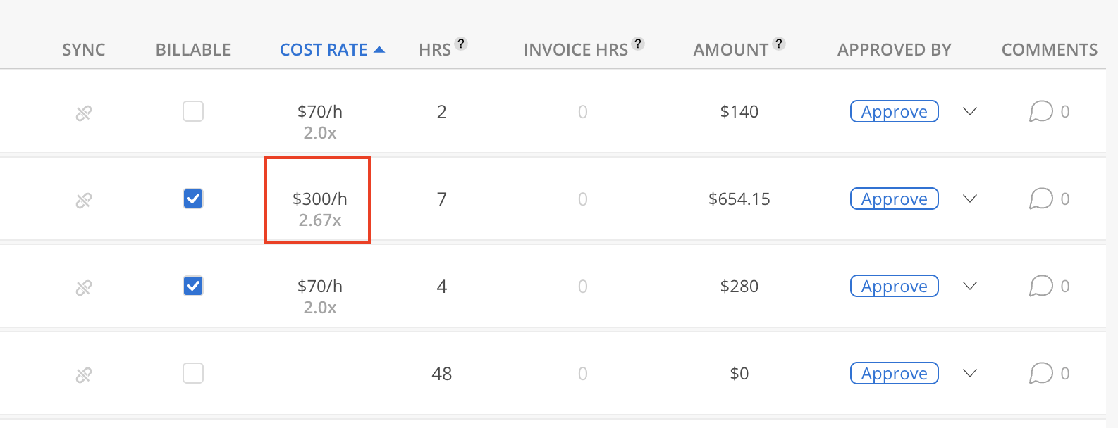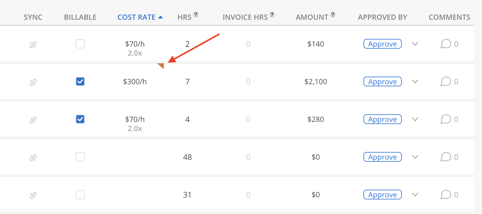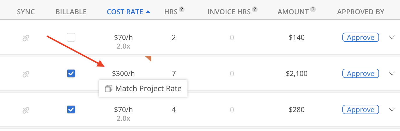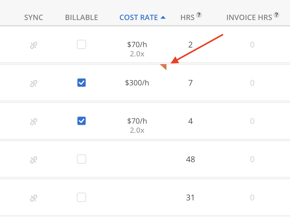 Click the Rate field with a red triangle on a timesheet to update it and match the current Project Rate.
