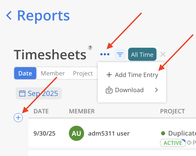 Time Entries can be added to this report for any user and project by clicking the blue plus sign in the top-left corner or using the three-dot menu at the top.