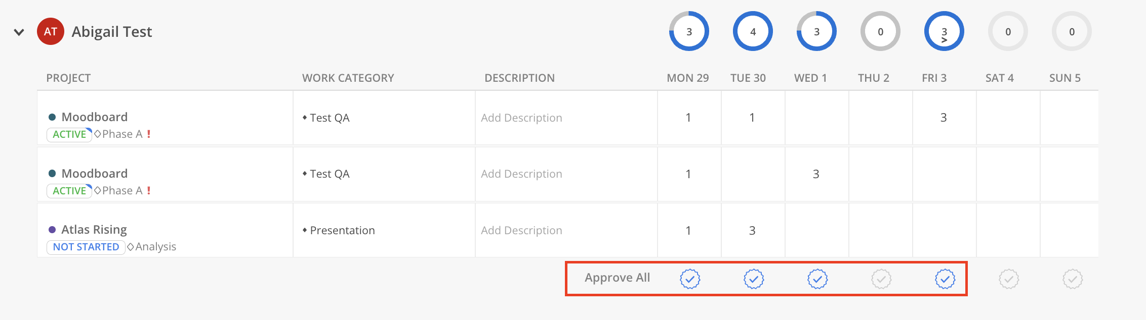 To approve all Timesheet for a specific day, click the checkmark icon beneath the corresponding date.