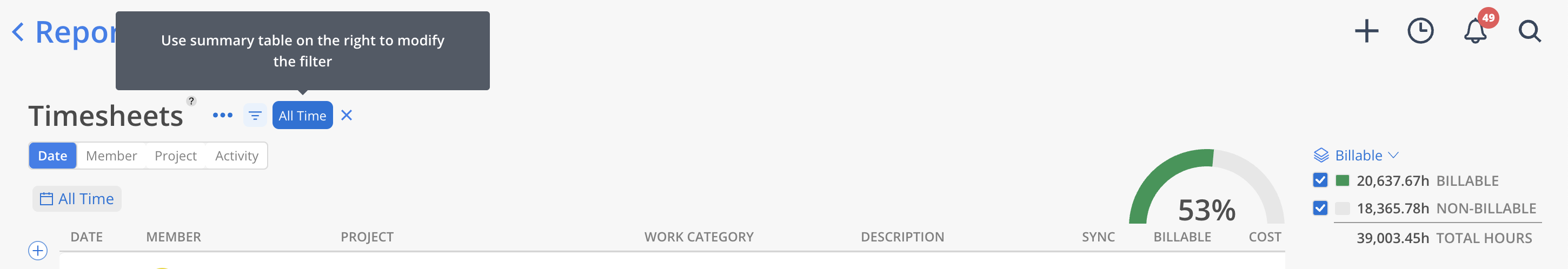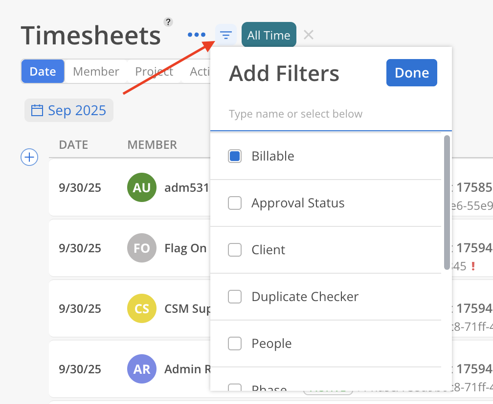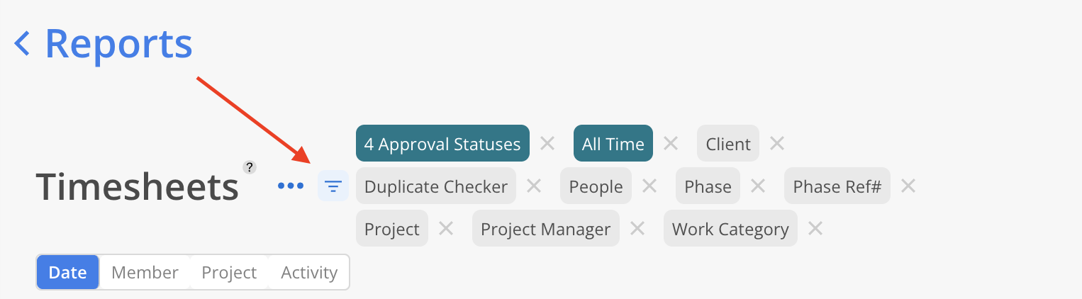 Click the filter icon at the top of the Timesheet Report to adjust the displayed results based on various criteria. Filtering helps refine the view to focus on specific Time Entries relevant to the analysis.