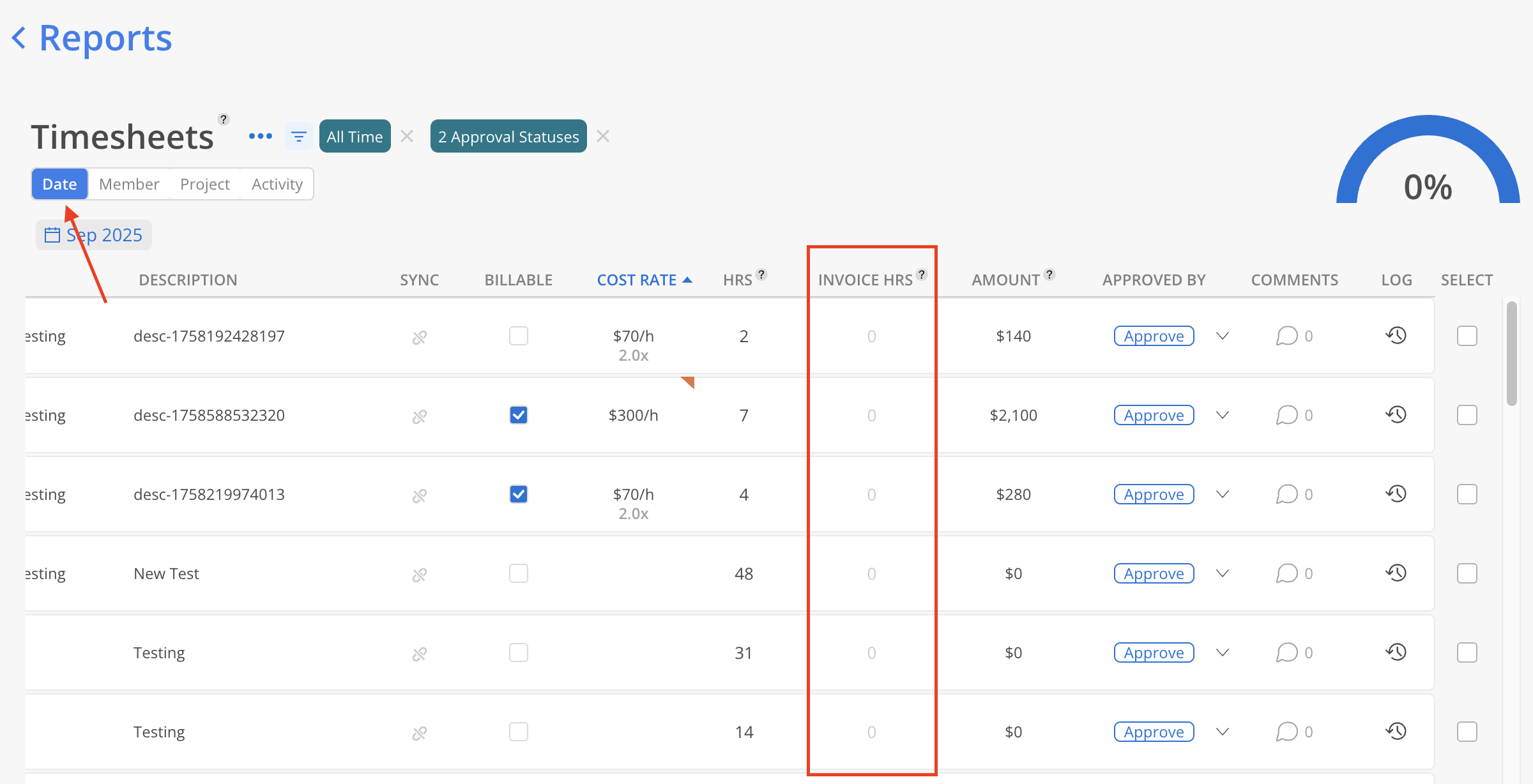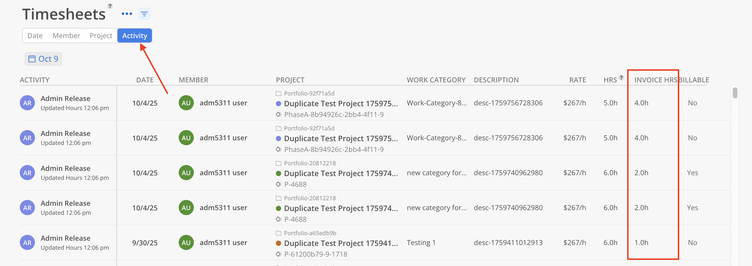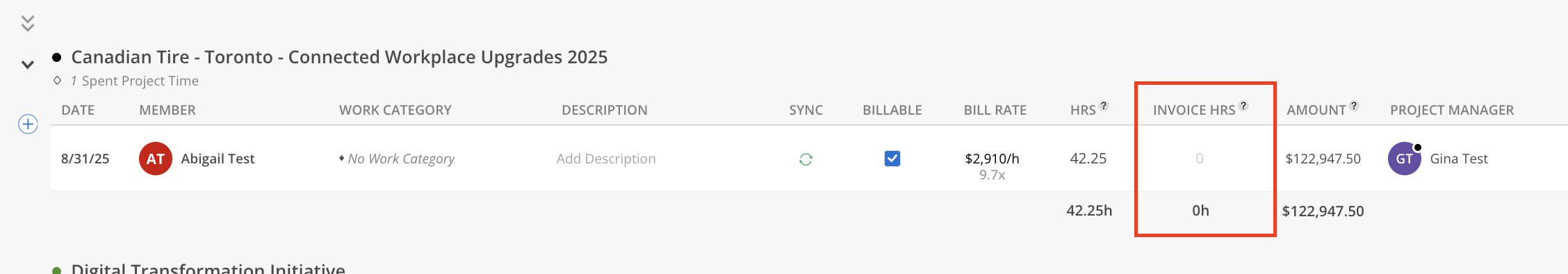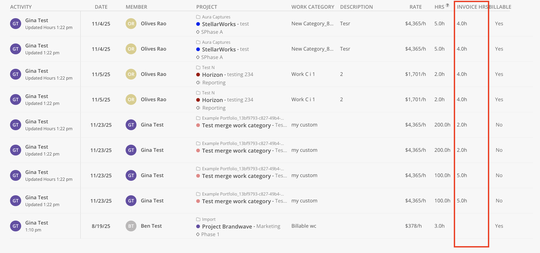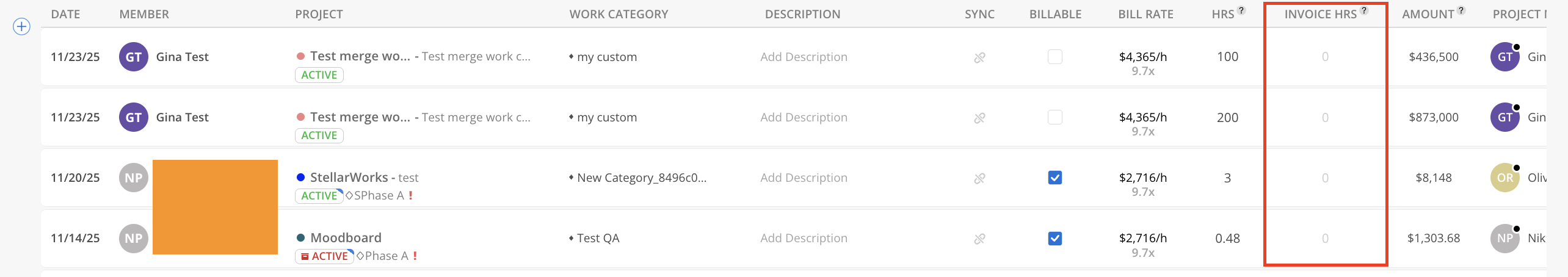 The Invoice Hours feature enables the saving and updating of a dedicated source of hours for time entries, offering enhanced flexibility and accuracy in managing time-related expenses. On Timesheet Report, there are several pages where you can see this column.