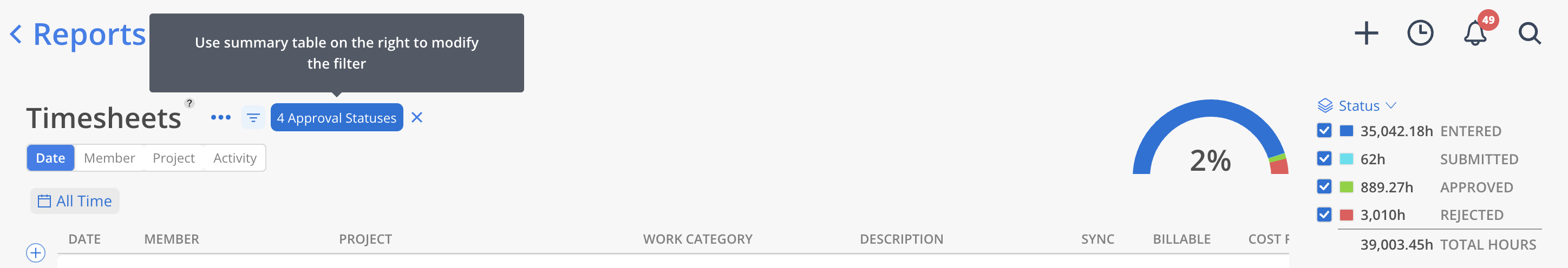 The Summary Chart provides a quick, visual representation of Timesheet data categorized by Status or Billable status, offering an efficient way to filter and view Timesheets based on selected criteria. The chart is available on the Date, Member, and Project tabs, but not the Activity Tab.