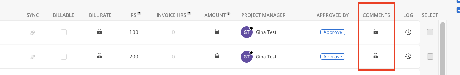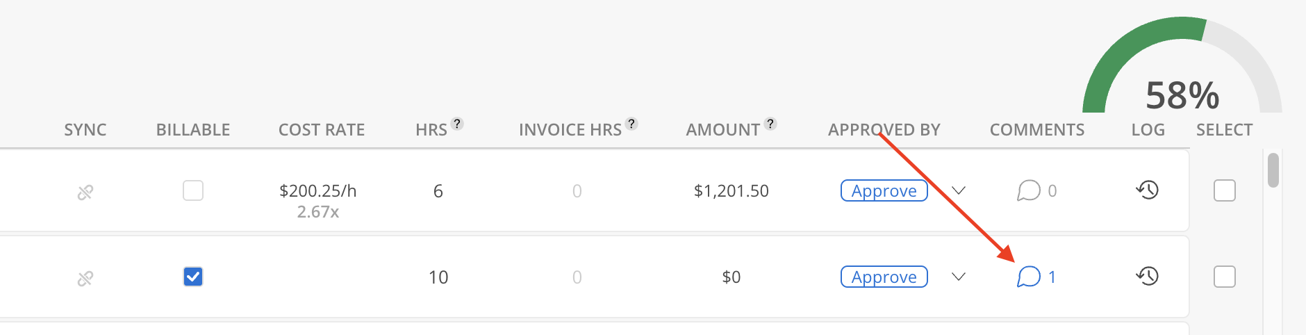 The comment count is displayed in the "Comments" column of the Timesheet.