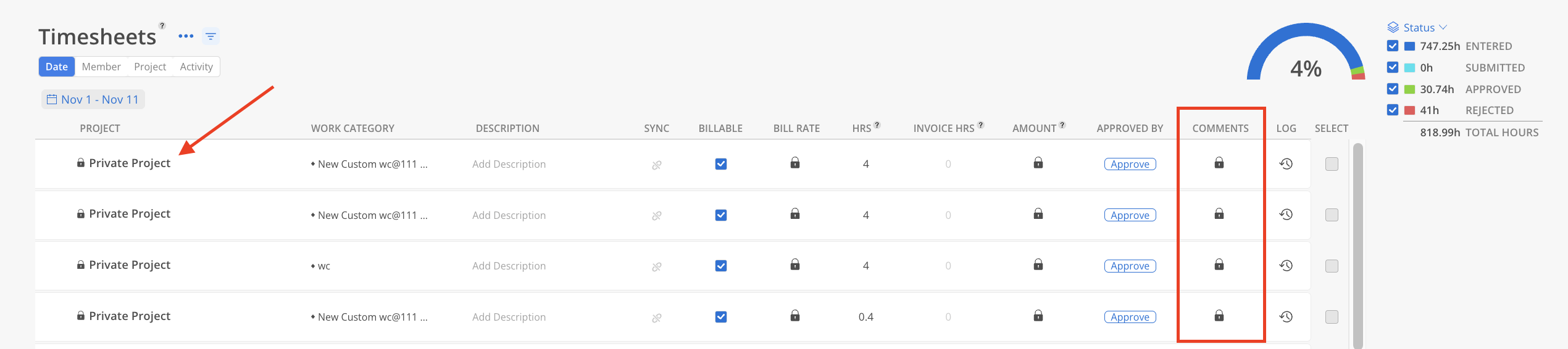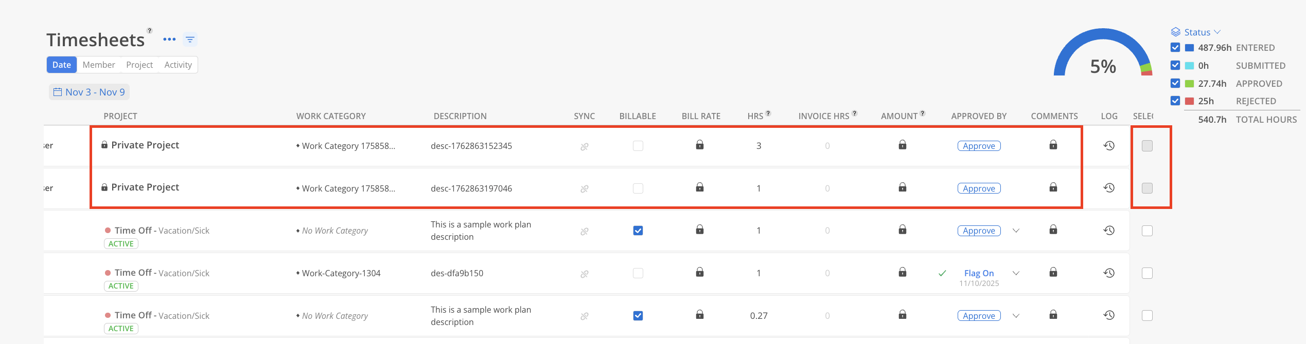 can only view projects they have access to (either as a member or as a Project Manager). Any Timesheets that they don't have access to, will show as Private Project and cannot be edited or selected using checkboxes.