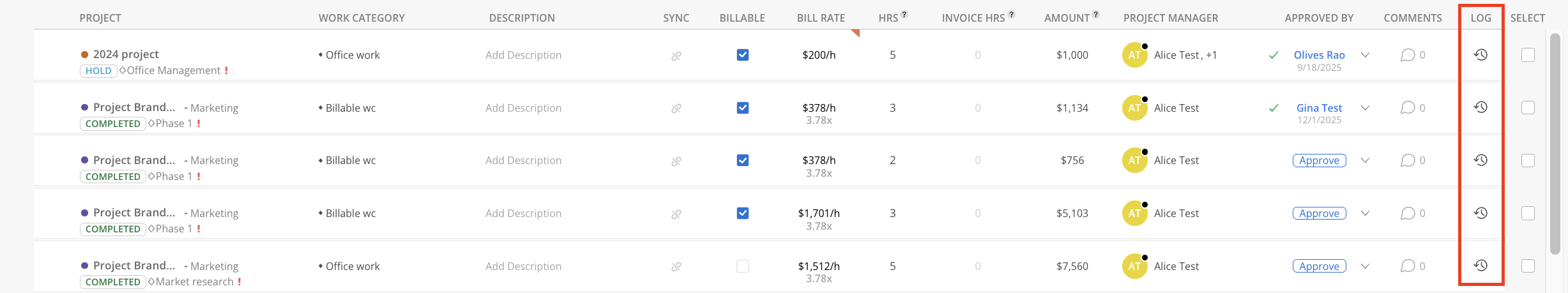 Click the log icon on the Timesheet to view its Activity Log, which includes a detailed history of actions taken—such as who created, edited, submitted, approved, or rejected the Timesheet—along with the date and day each action occurred.