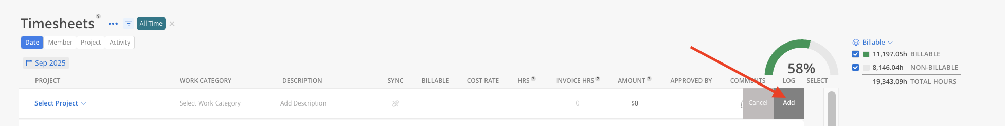 Select the Date, Member, Project, Phase or Subphase, and a Work Category. For some Work Categories, a description is required for the Time Entry; otherwise, it is optional. Enter the hours worked. If applicable, input the invoice hours, then click Add on the very right side.