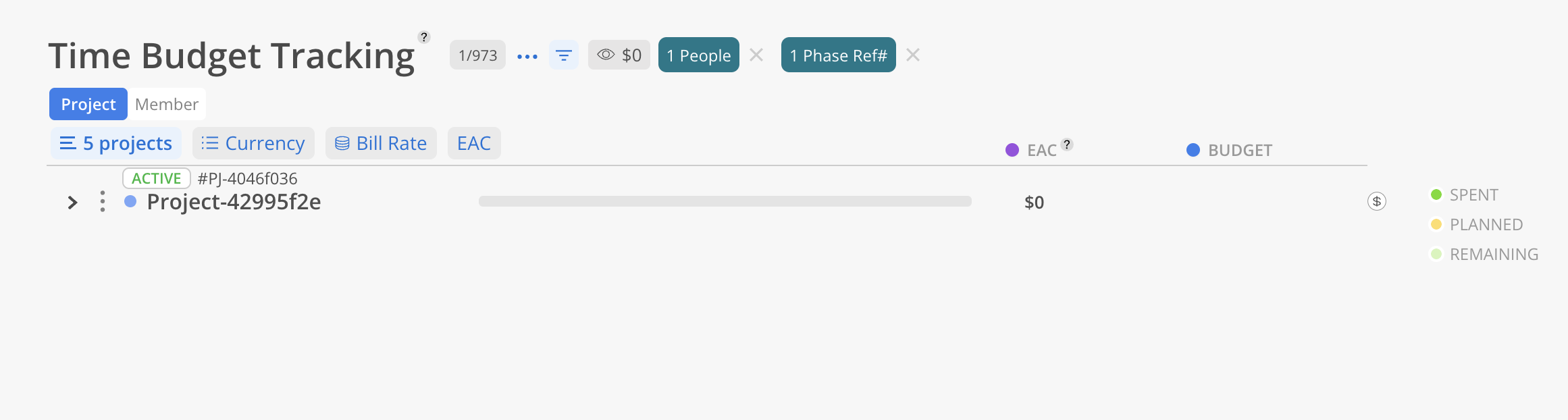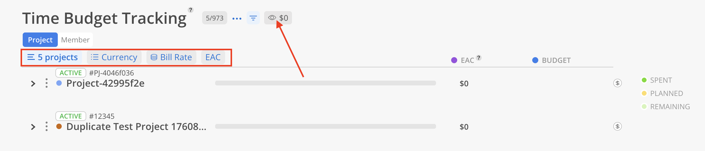 Hours vs. Currency: Switch between displaying time in Hours or budget in Currency, depending on reporting needs. This option only shows on EAC view.