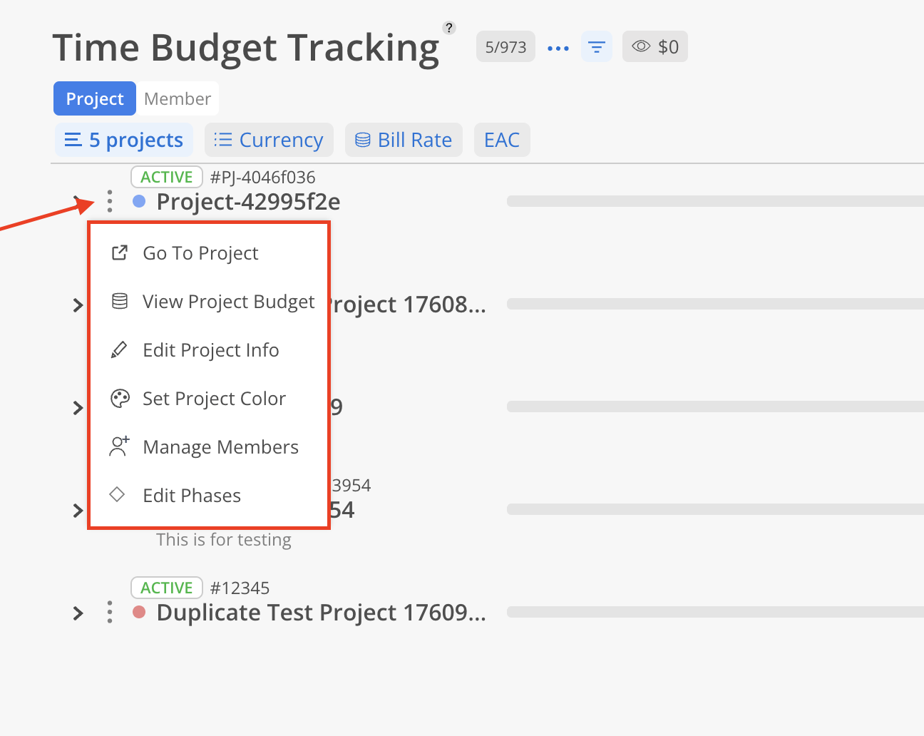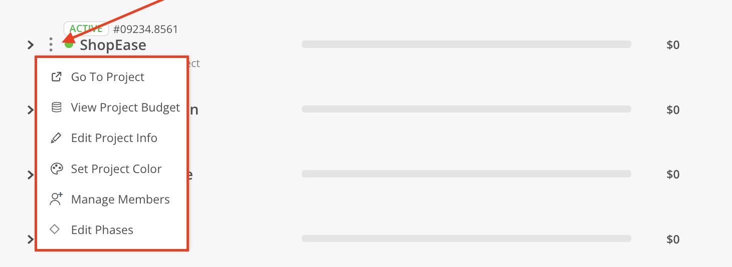 Click on the three dots of a Project. You can go to the Project in a new tab, view Project budget, edit Project information, set Project color, manage Project members and edit Phases in this Project.
