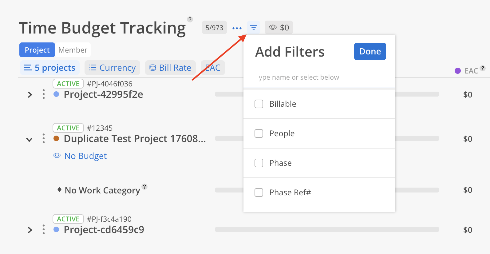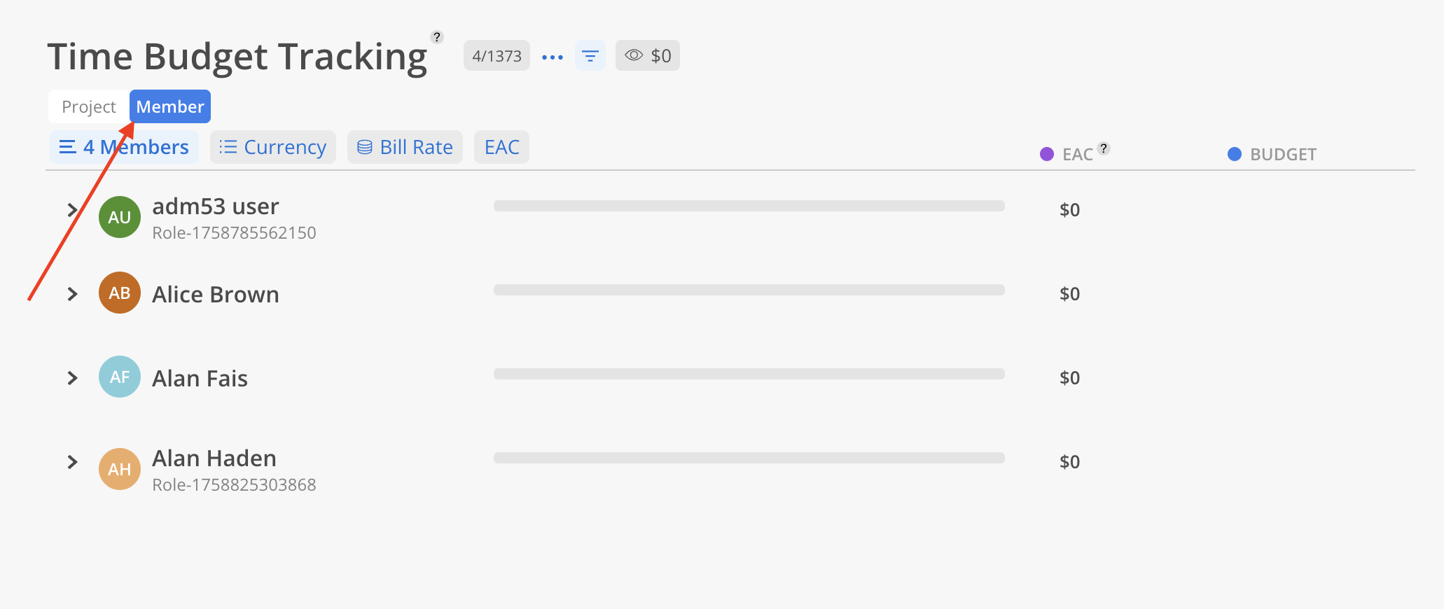 Budgets can be reviewed by Project or Member, depending on the selected tab. The display can be customized using the following options: