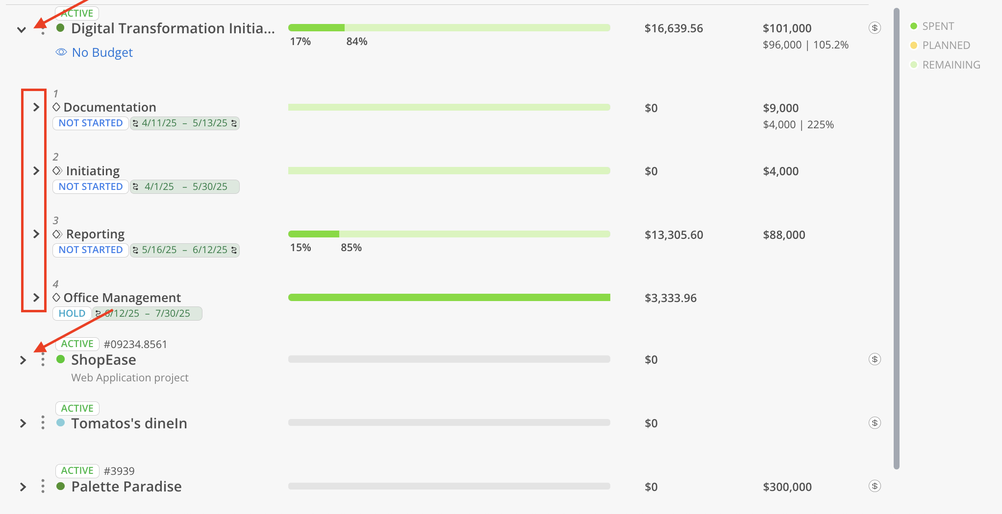 Use the caret on the left of a project's title to see the time broken down by phase and then by member
