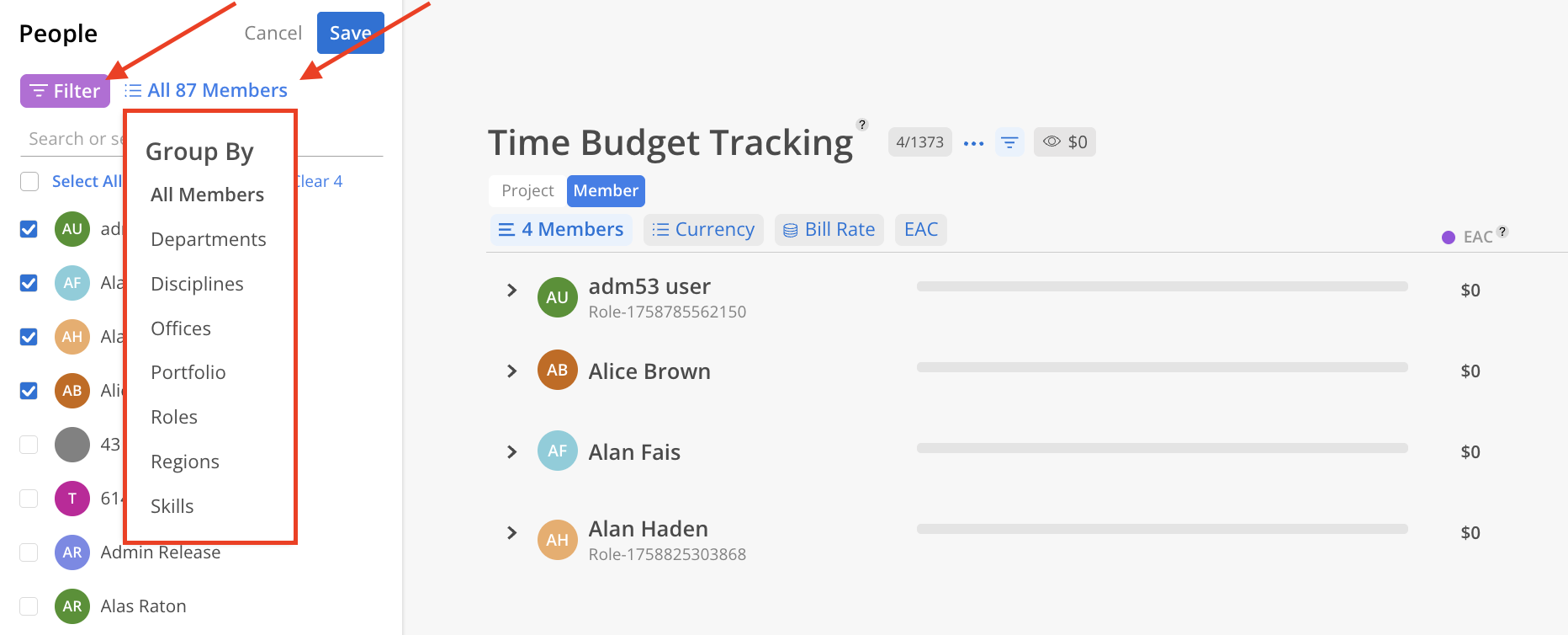 Click All Members to group Members by Departments, Disciplines, Offices, Portfolios, Roles, Regions, Skills