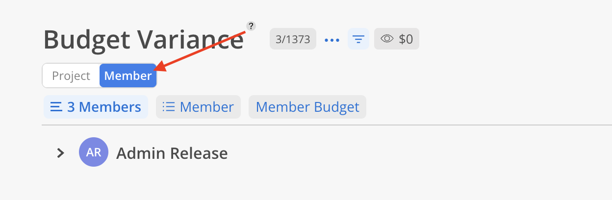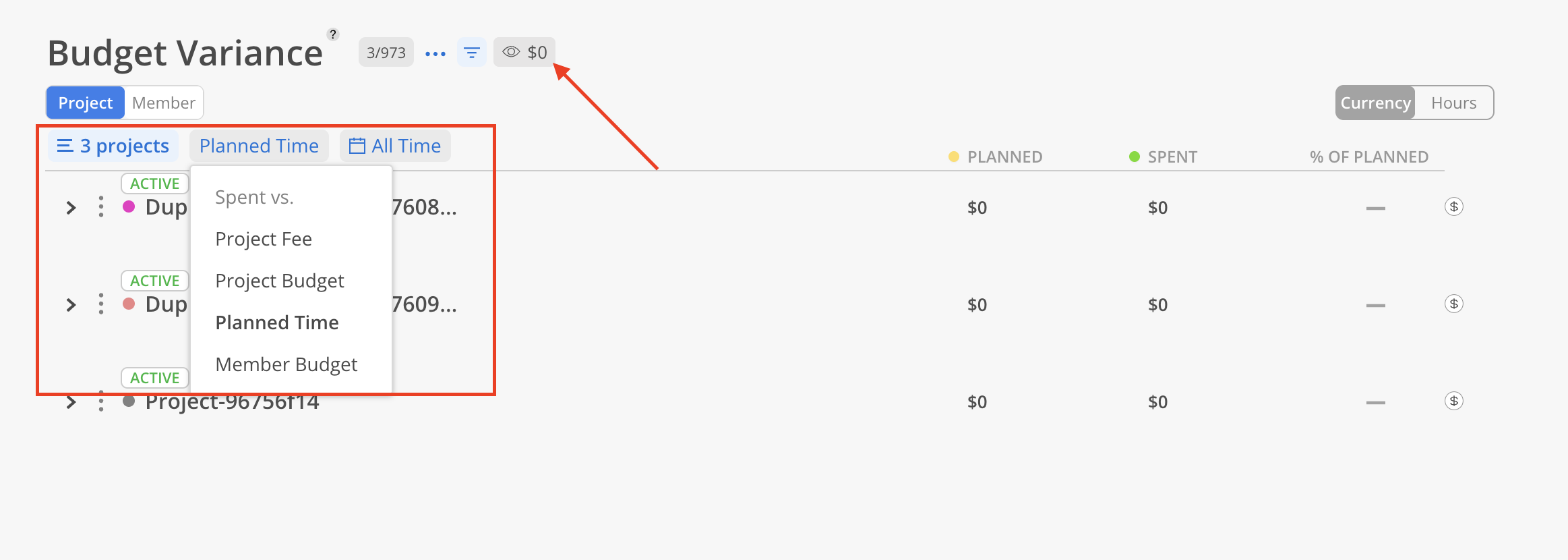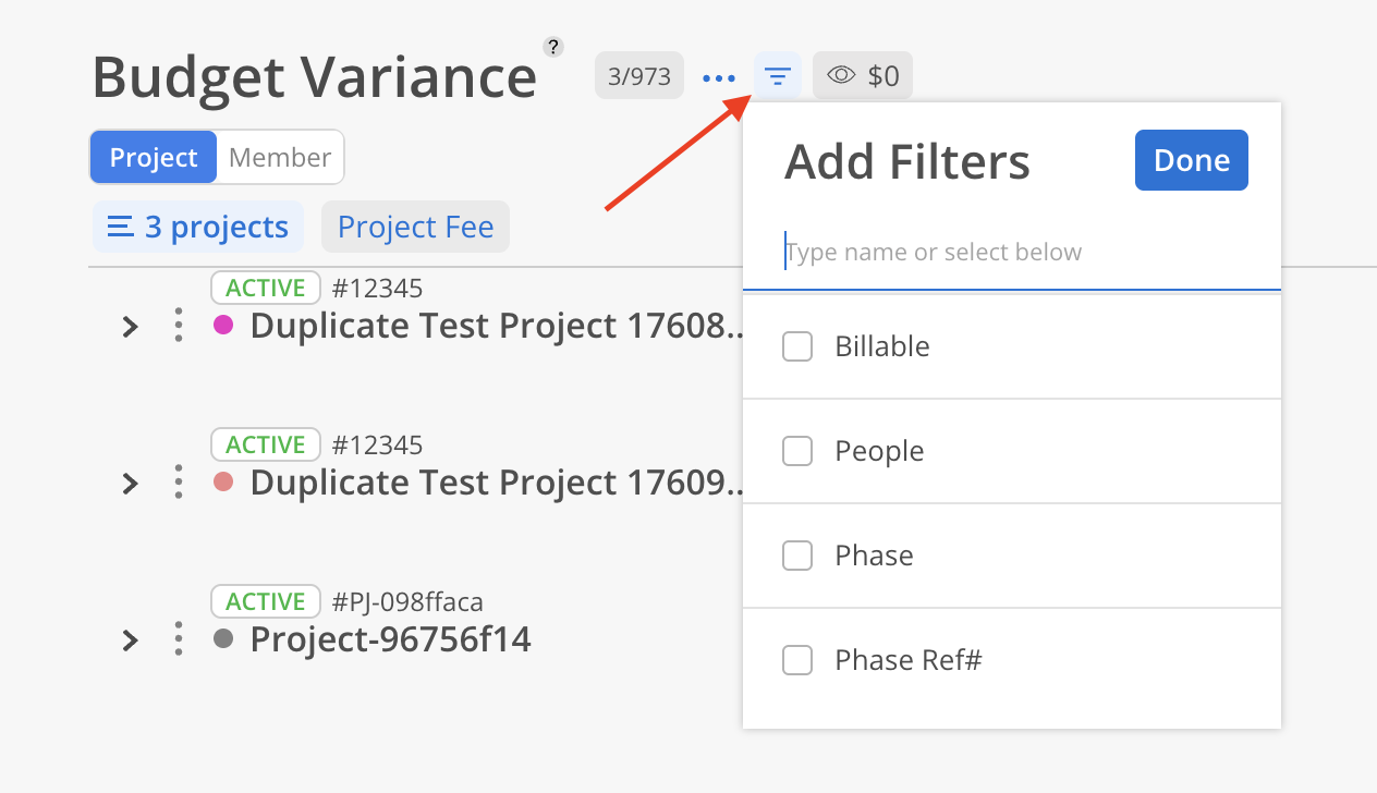 Hide No Variance: Located next to the filter button, this button hides or shows Projects with no variance.