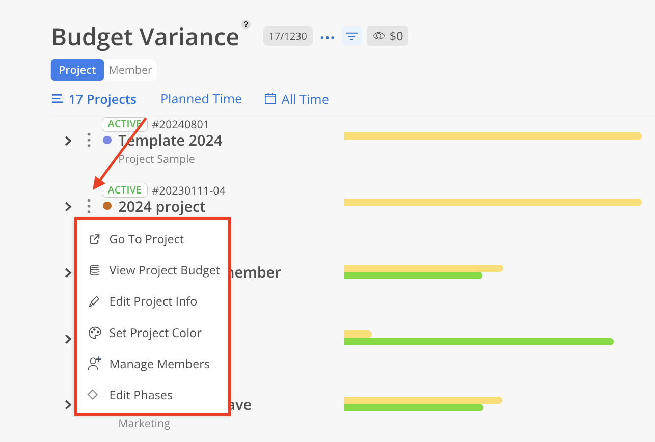 Click on the three dots of a Project. You can go to the Project in a new tab, view Project budget, edit Project information, set Project color, manage Project members and edit Phases in this Project.