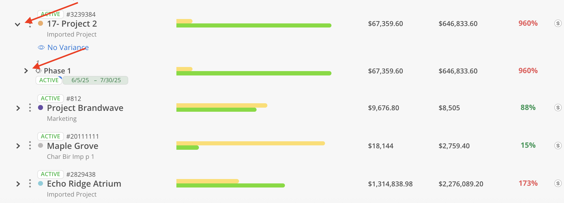 A Project can be expanded to display the budget variance breakdown of its Phases and Subphases. A Phase can be expanded to display the breakdown of its Work Categories and Members.