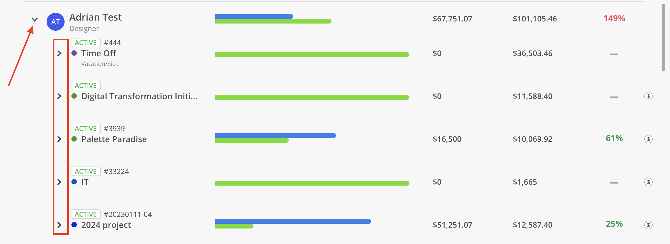 A Member can be expanded to display a breakdown of the Projects and Phases that that Member belongs to.