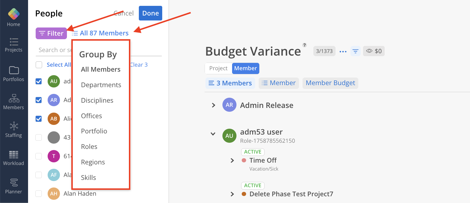 Click All Members to group Members by Departments, Disciplines, Offices, Portfolios, Roles, Regions, Skills.