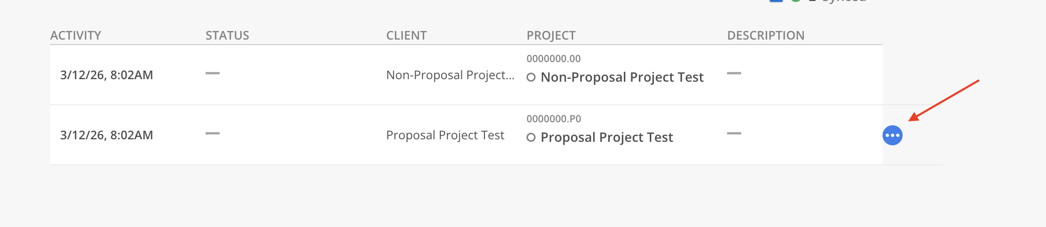 Additional actions are available for each record across all data types (e.g., Members, Projects, Clients, etc.) These actions can be accessed by clicking the three-dot menu icon located on the far right of each row.