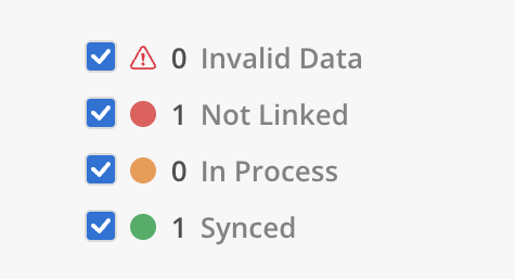 Not Linked (red dot — the data exists but is not linked to the external system)