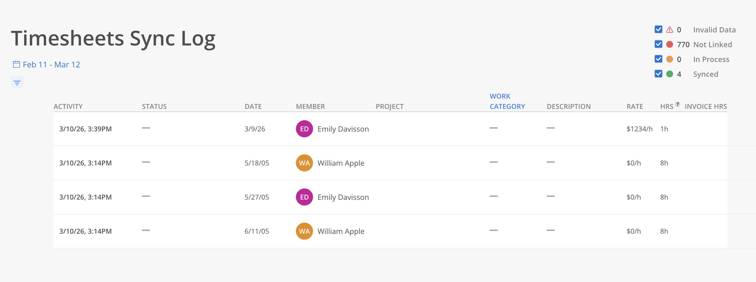Invalid Data (warning icon): Required fields (e.g. role, dates, or allocation) are missing or malformed, preventing the record from syncing
