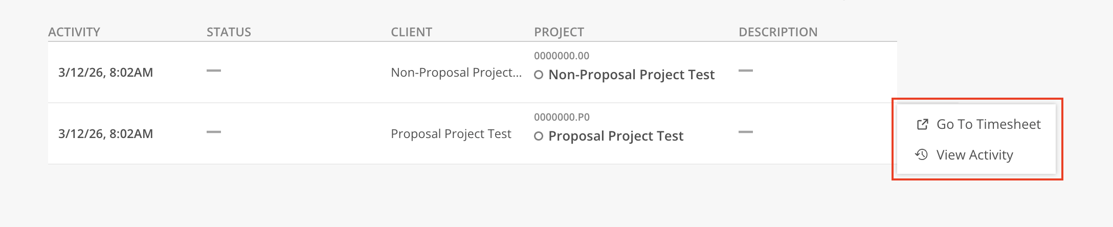 View Activity: Redirects to Timesheet Report > Activity tab to view Timesheet Activities