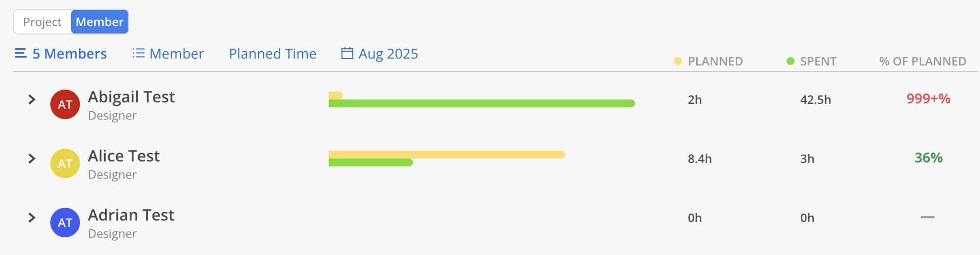 You will see two bars next to each member's name. Also, on the right-hand side of each member row, a green or red percentage is displayed.