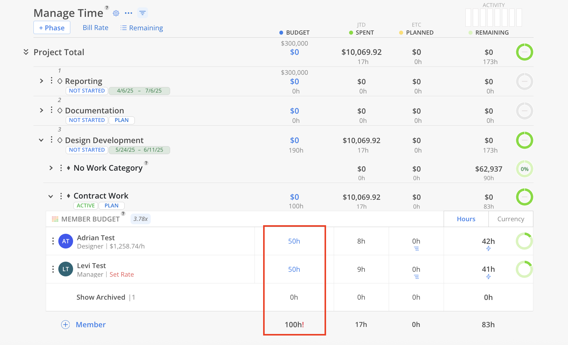 The Budget column indicates the estimated hours assigned to the member in the budget modal, while the Spent column displays the total hours logged in the timesheets. The aggregated estimated hours for members are displayed at the work category, phase, and project levels.