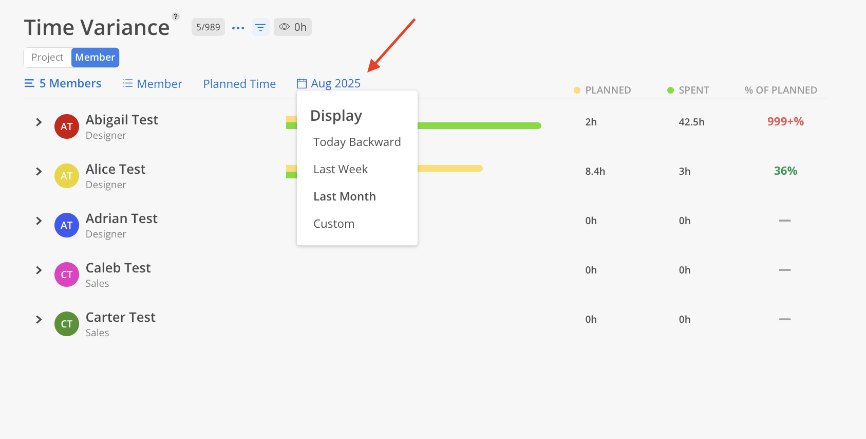 Decide which variance you would like to view: "Spent Time vs. Planned" or "Spent Time vs. Member Budget”.