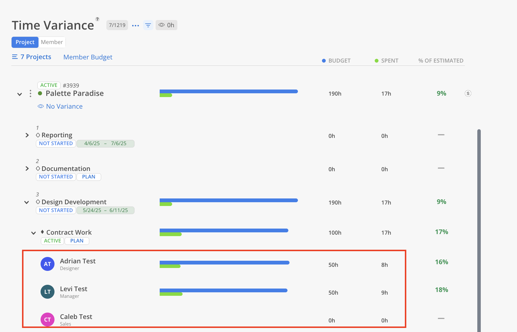 Expand the Member to see how the Member's variance breaks down by Project and by Phases, Subphases and Work Categories.
