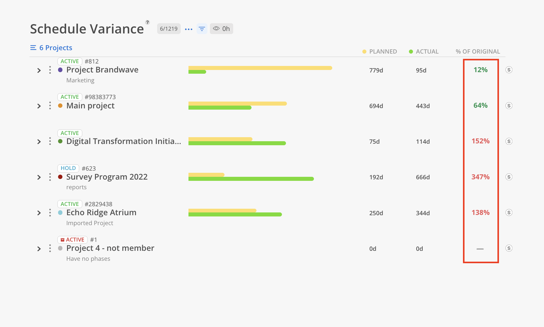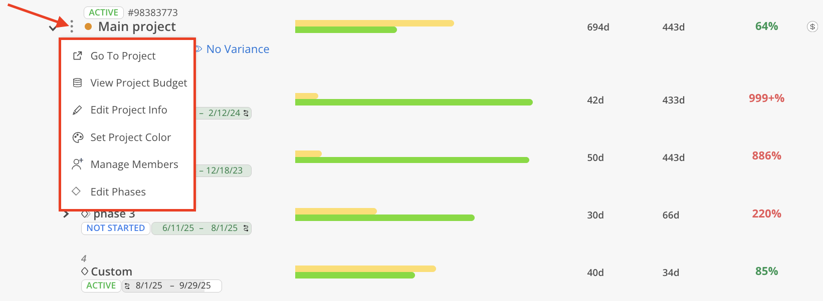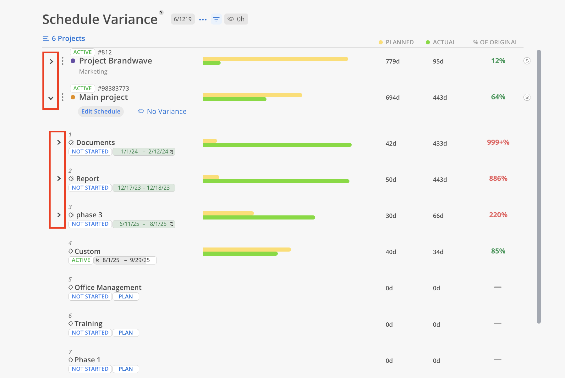 Expanding a Project will allow you to see the variance of each individual Phase and Subphase.