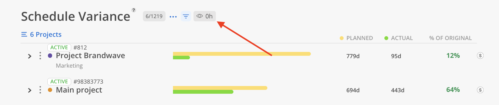 Use the No Variance button on the top to hide the projects when the planned column is blank or there is no variance.