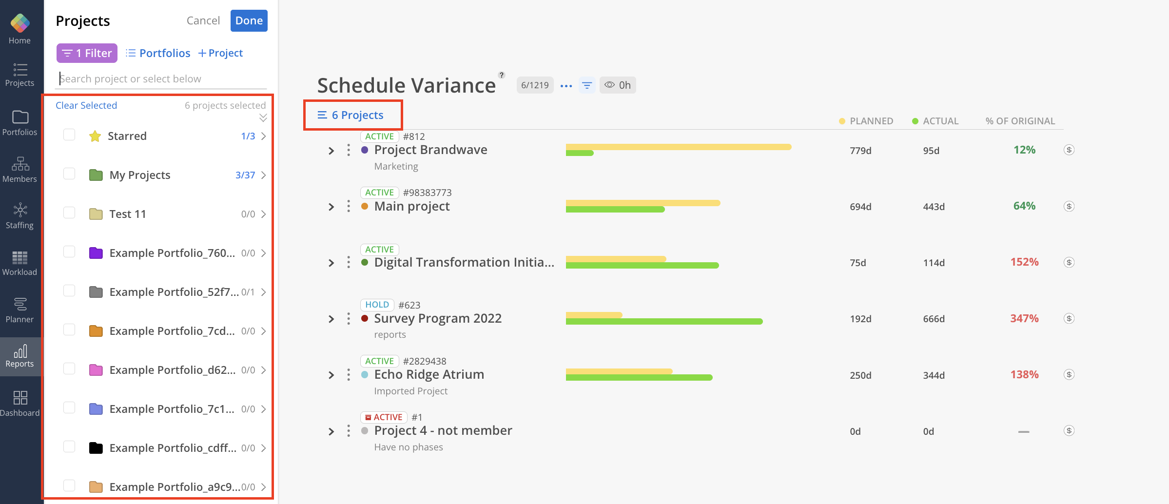 The Schedule Variance Report allows you to look at a project's initial workday estimates or planned time vs. the actual number of days worked. All filters and selected Projects in this report are automatically saved for future use.