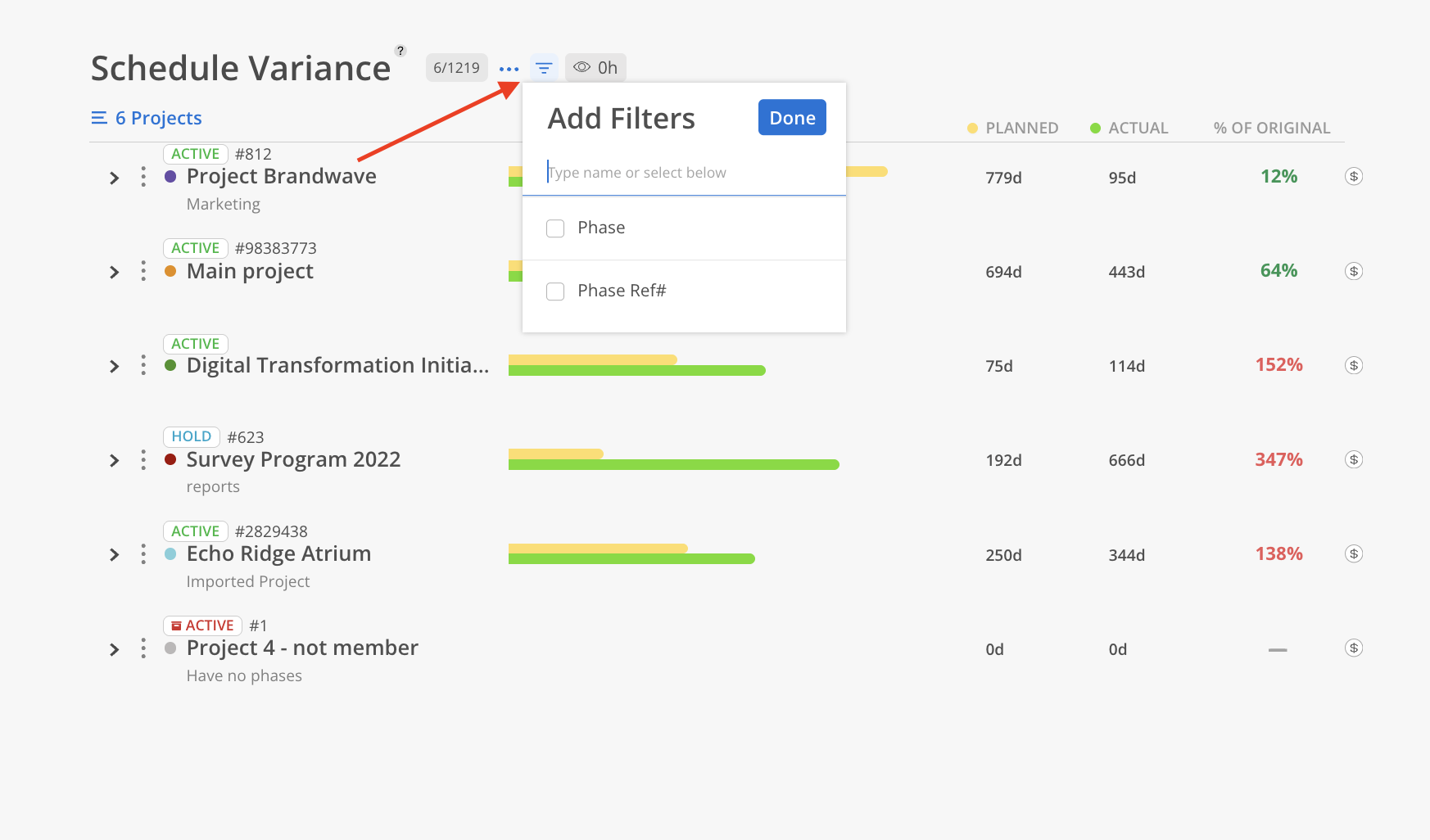 Use the top filter to narrow the selected projects by phase or phase ref#. Applied filters will be highlighted in purple.