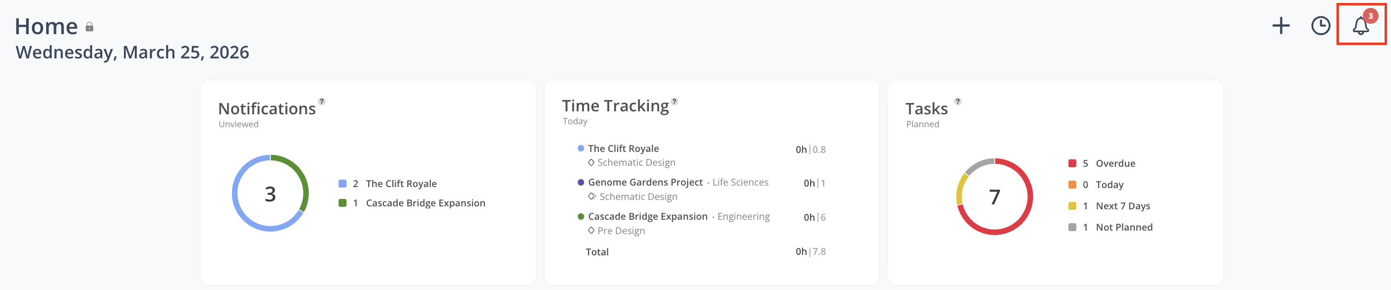 The Notifications widget provides a centralized view of updates relevant to your work in Mosaic. It helps you stay informed of changes across projects, tasks, time tracking, and system activity, enabling you to take timely action when needed.