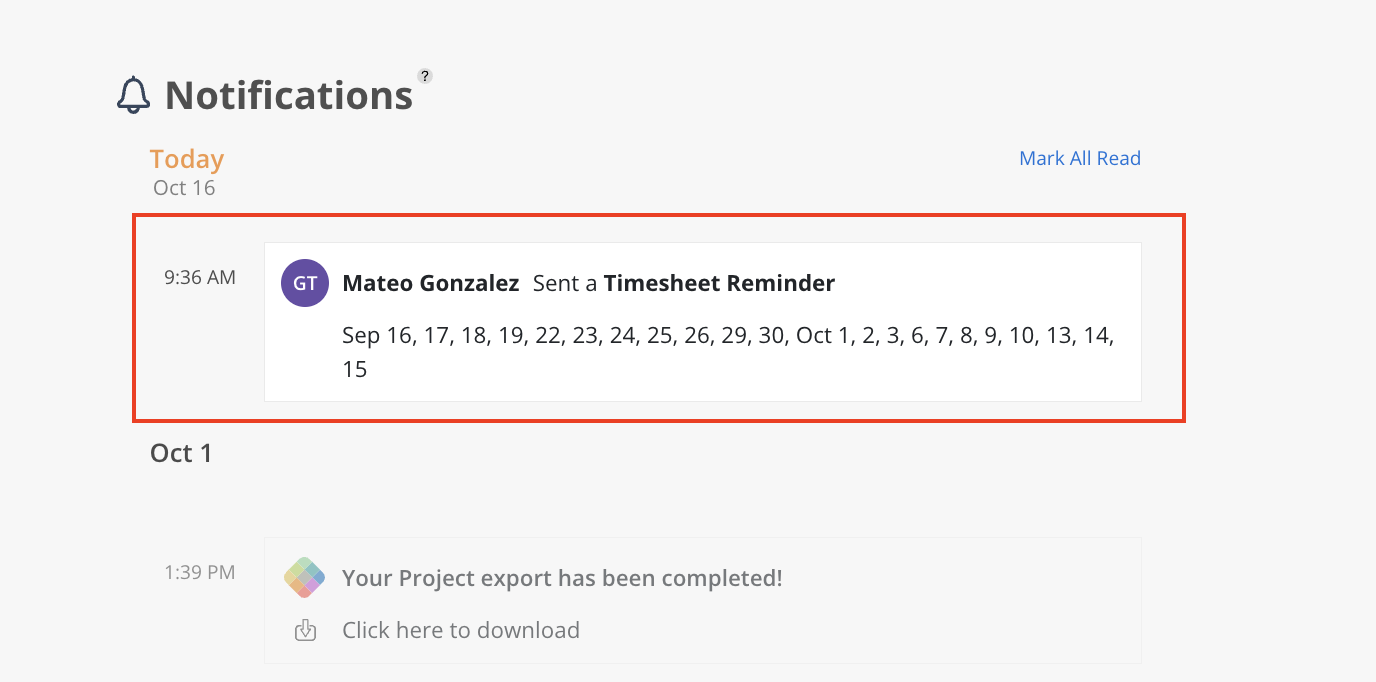 Click on the notification to be redirected to the Timesheet page. From there, the missing Timesheet entries for the listed dates can be reviewed and completed.