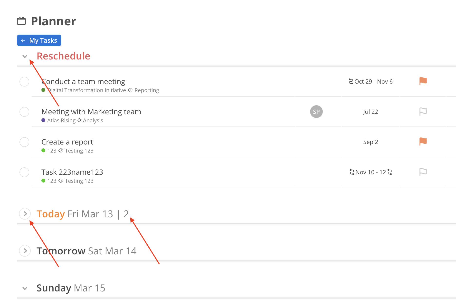 To collapse or expand tasks under a specific day or Reschedule section in the Task Planner, click either the day header (e.g., Today Fri Mar 13) or the arrow icon next to it. When a day is collapsed, a count of tasks due on this day will show next to the date.