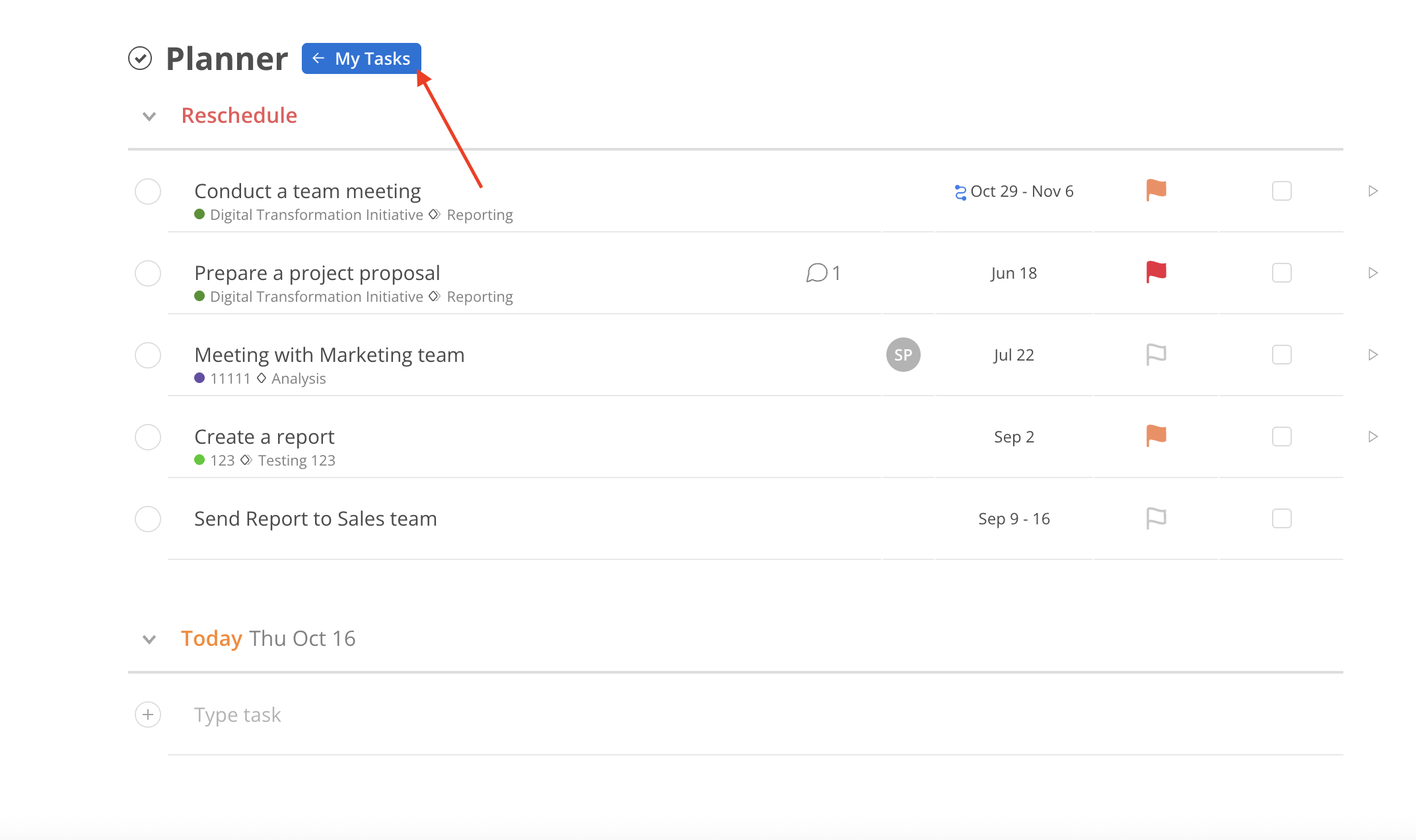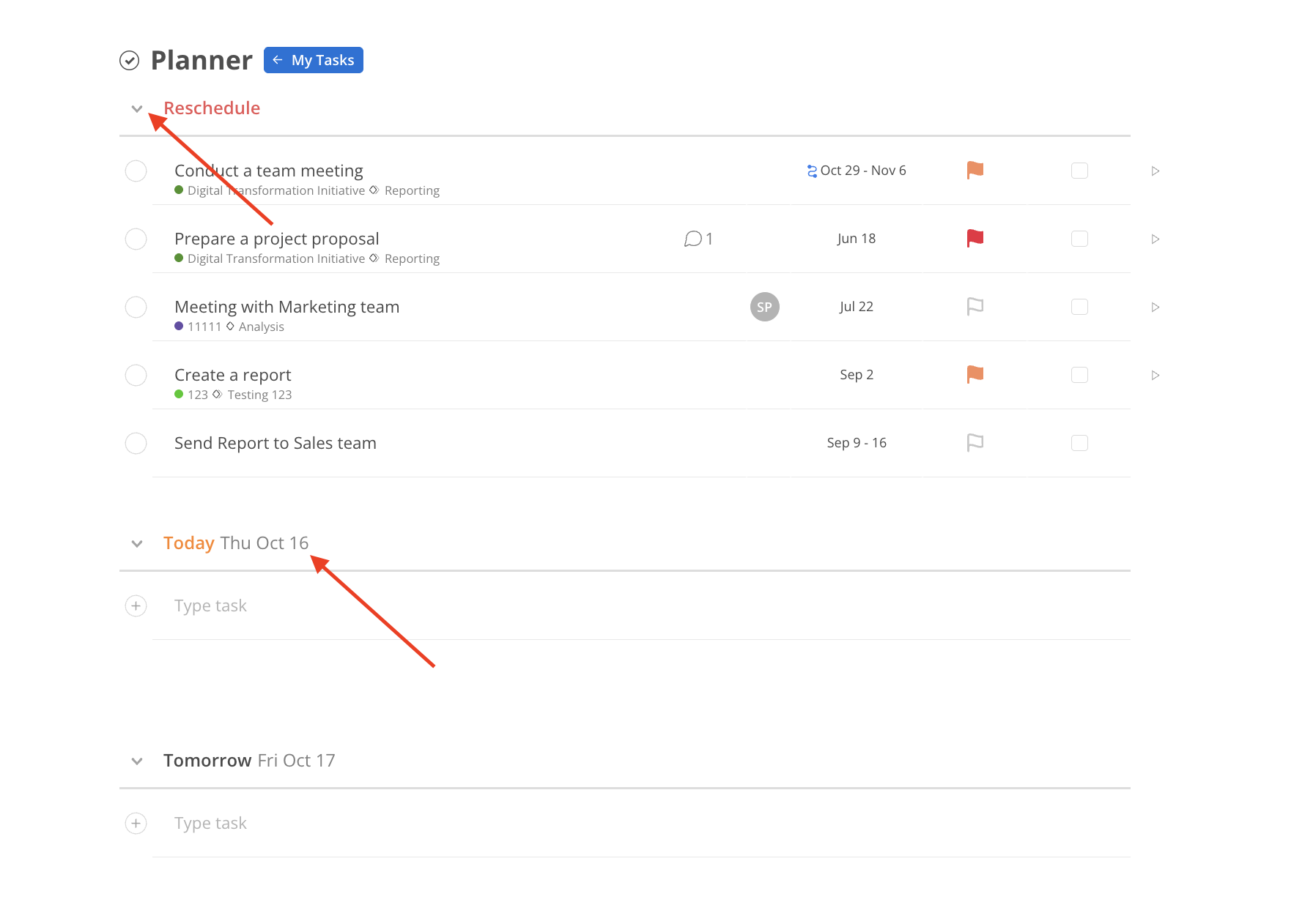 To collapse or expand tasks under a specific day or Reschedule section in the Task Planner, click either the day header (e.g., Today Thu Oct 16) or the arrow icon next to it.