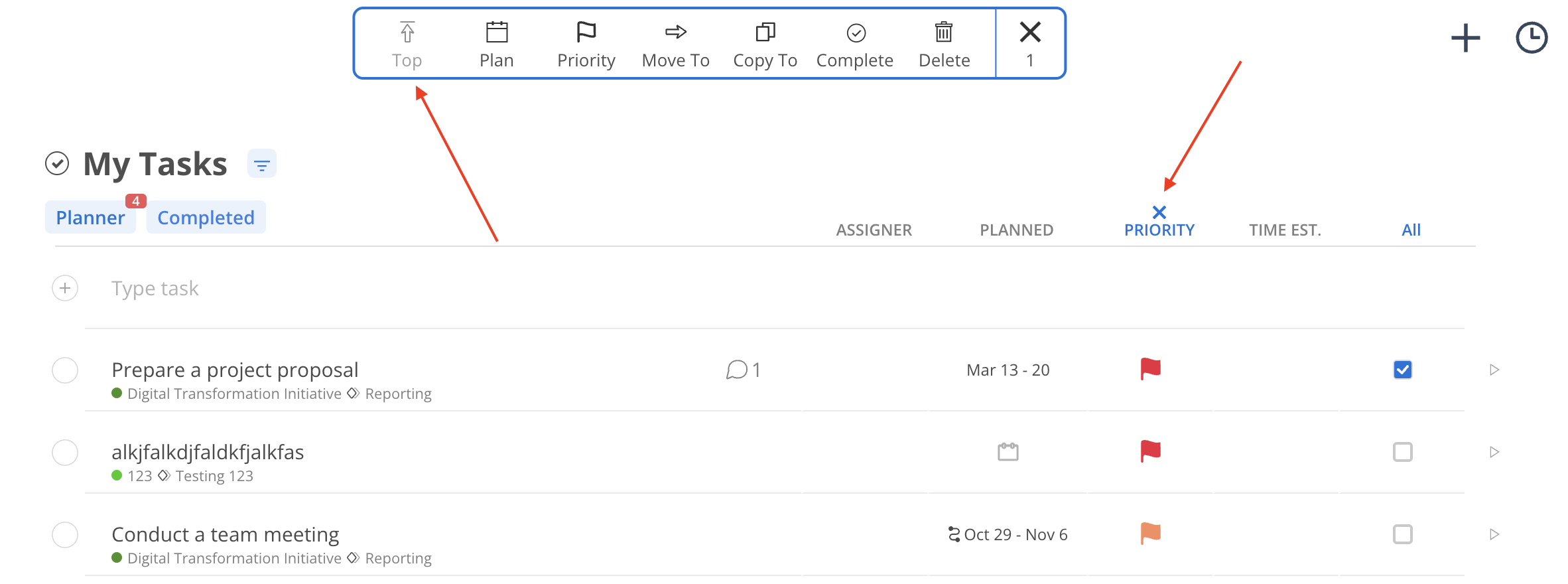 Set the optional planned date and/or priority, then press enter on the Task. It may take a few seconds. Project and Phase name (if not default Phase) will show under the task.