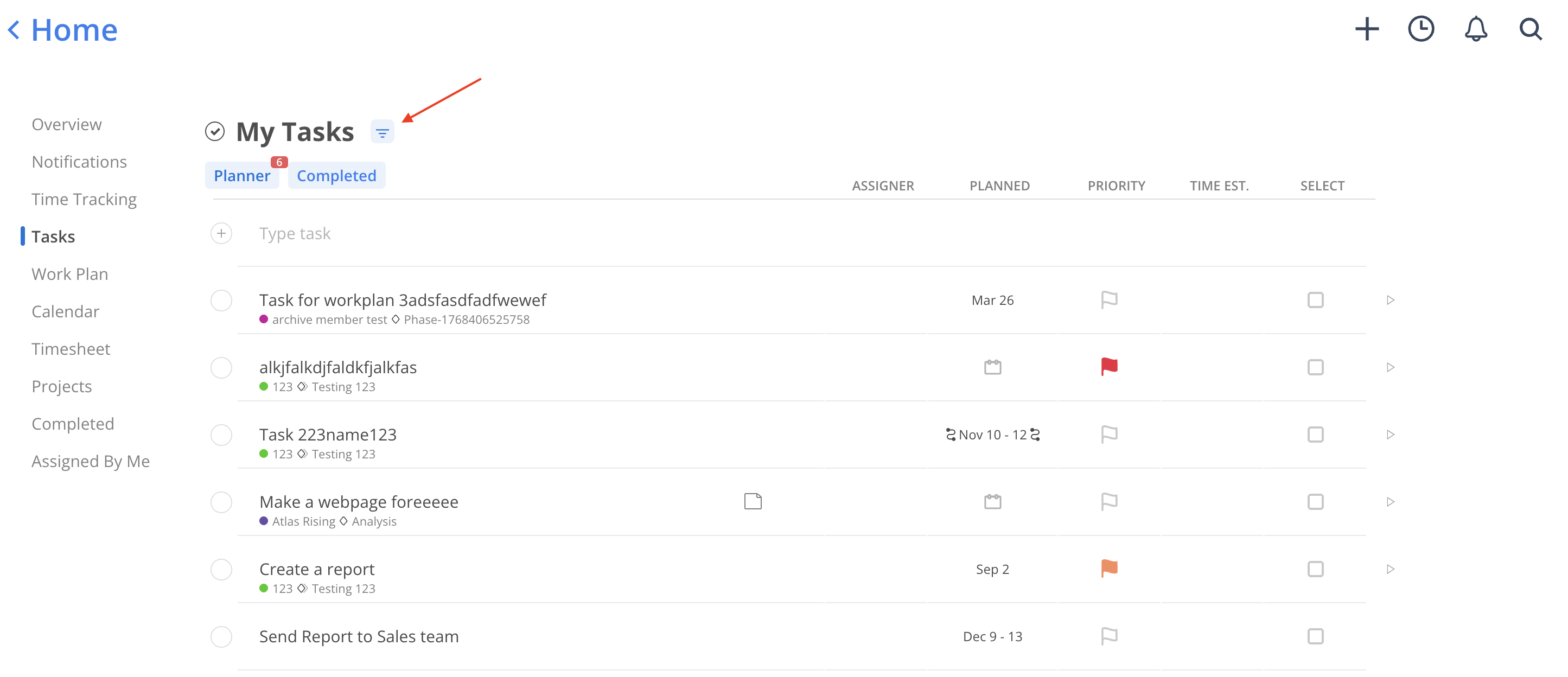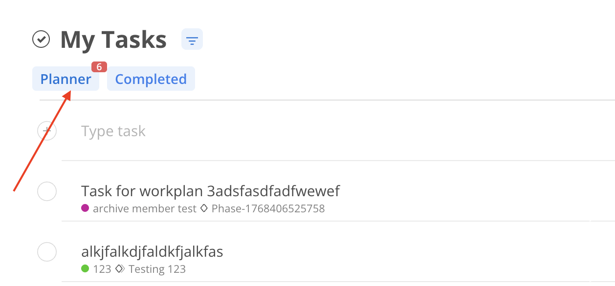 The Planner view helps visualize Tasks scheduled by day or week. If there are overdue Tasks, a red badge displays the count on the Planner button.