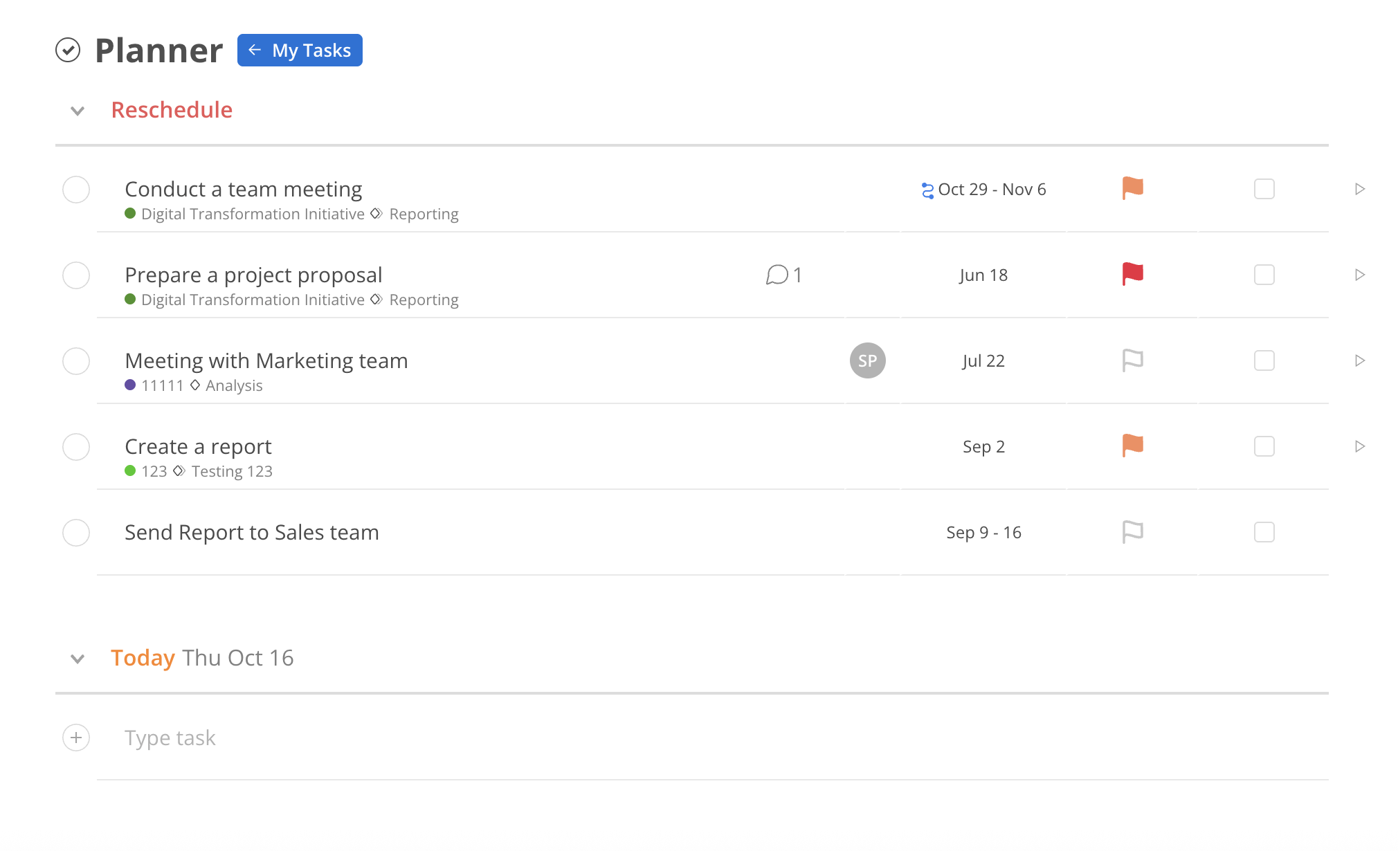 This page provides an organized view of Tasks assigned to or created by current user. These can also be displayed in the Planner layout. The tasks can be personal or team tasks.