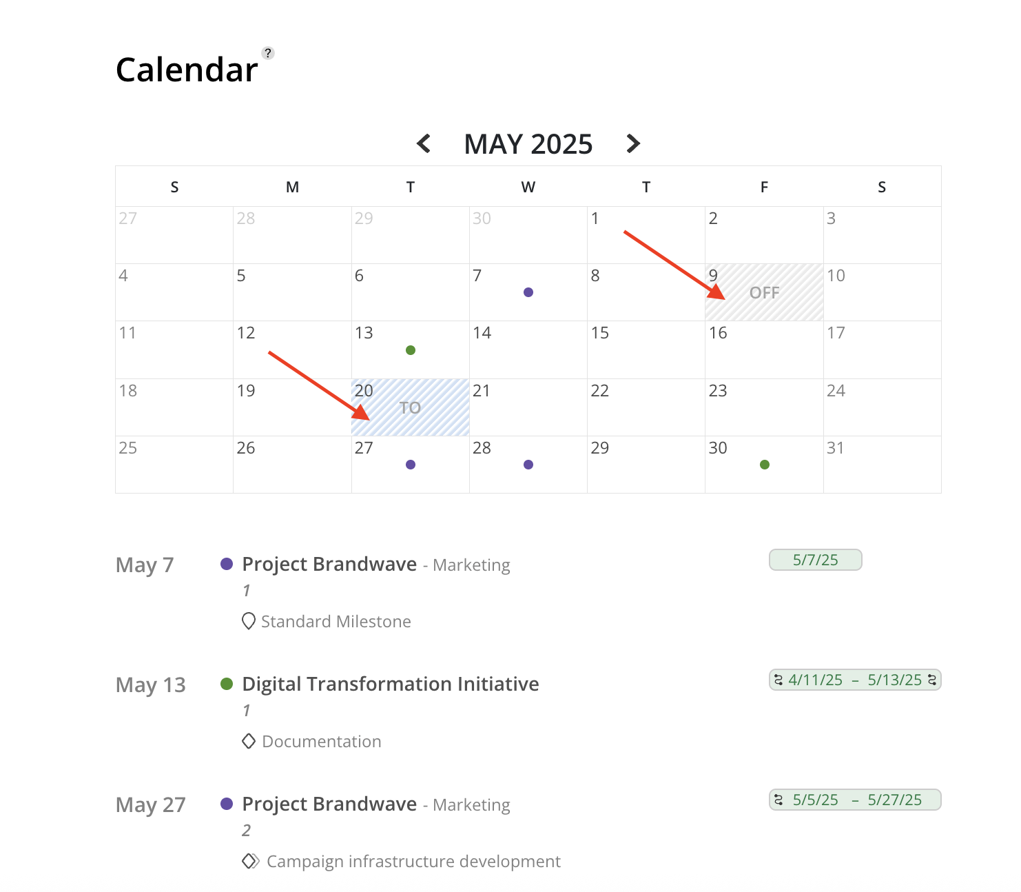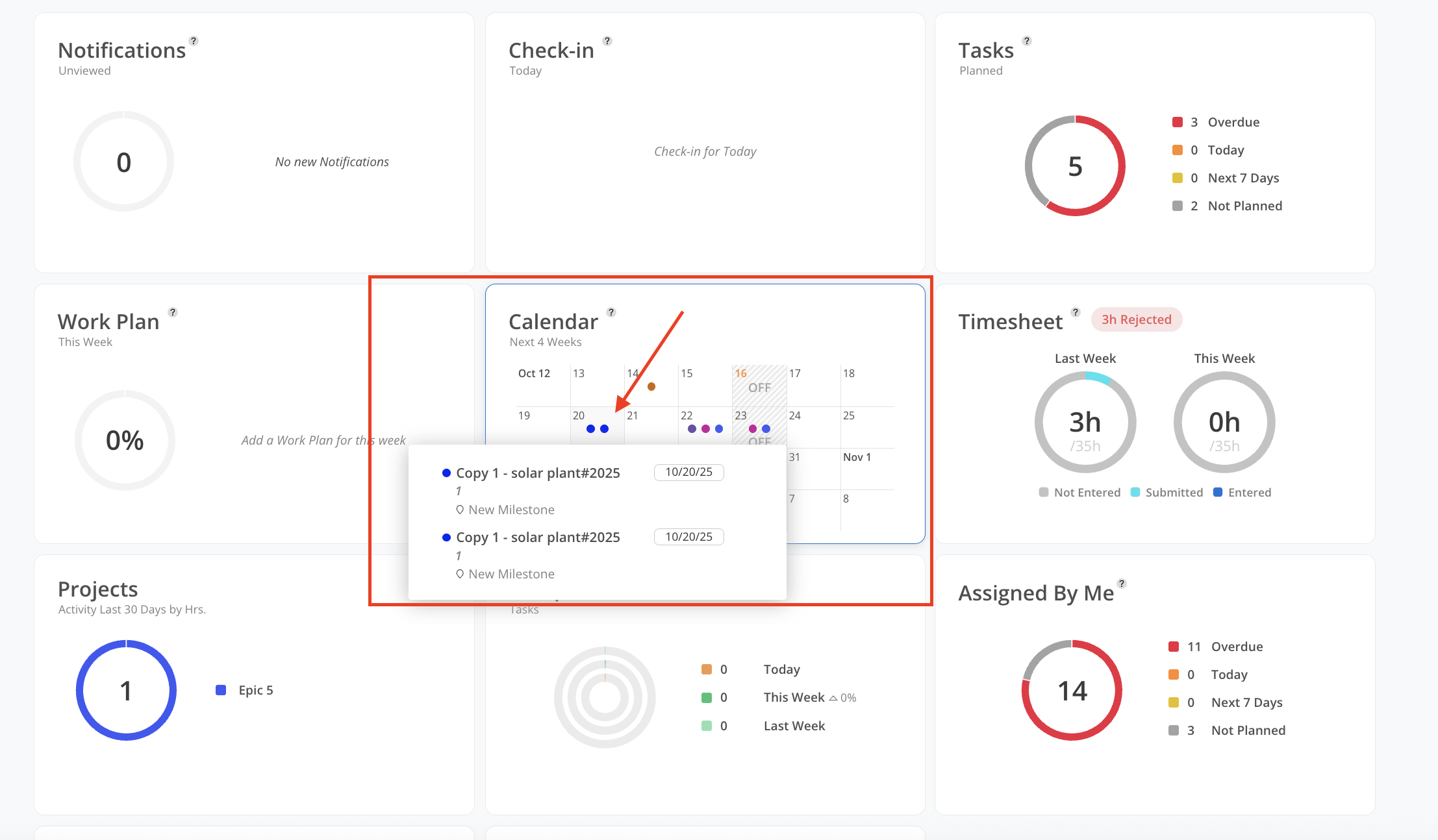 The Home page features a calendar widget that highlights upcoming, TO, holidays, milestones and project phases end date you're involved in within the next 4 weeks. Simply hover over the dot to access more information.