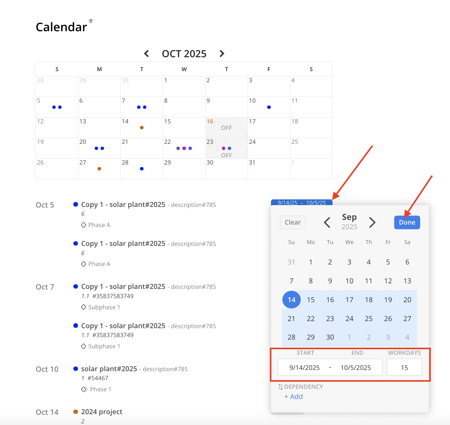 Click on the date range displayed next to the Phase (e.g., 9/14/2025 – 10/5/2025).