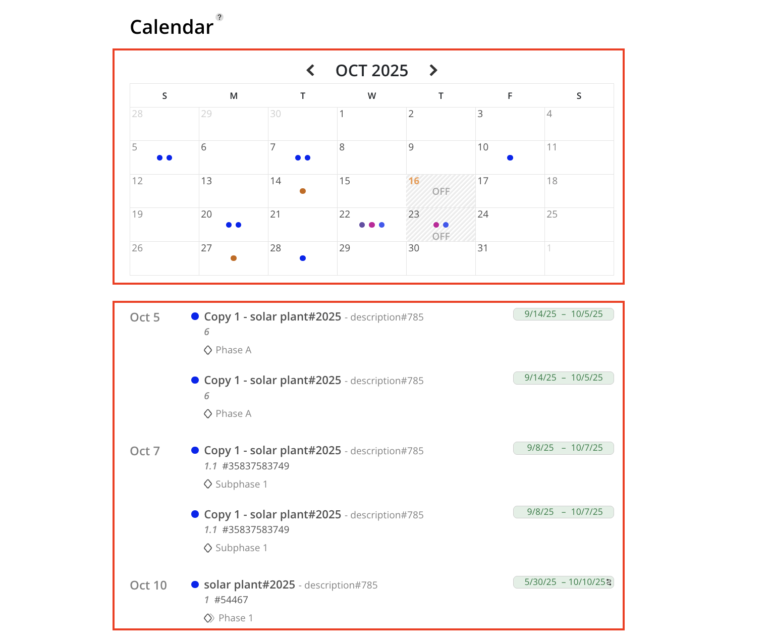 List View (bottom): A chronological list of items with detailed descriptions, dates, and associated Phases or Subphases.