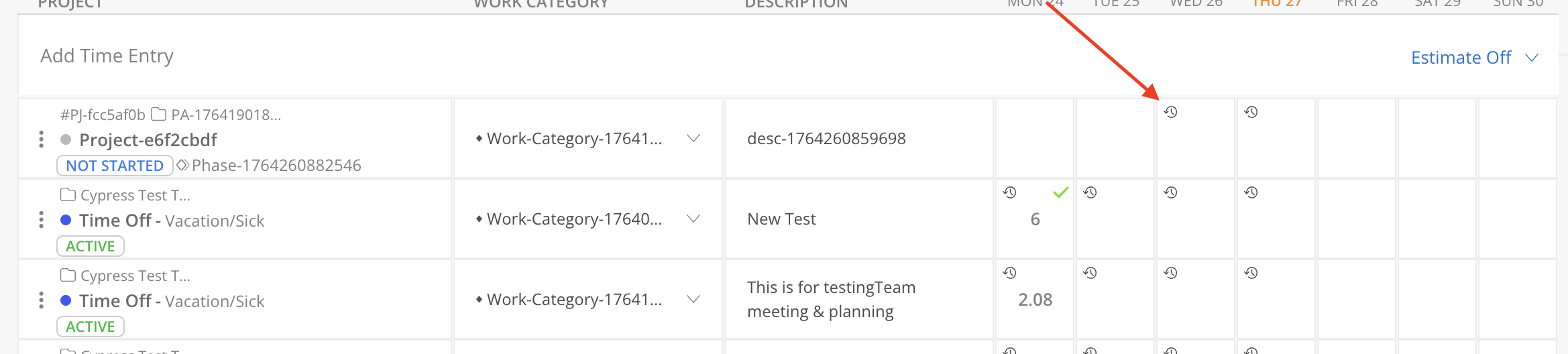 Timesheets that have a calendar icon indicate entries that have been automatically carried over from the previous week.