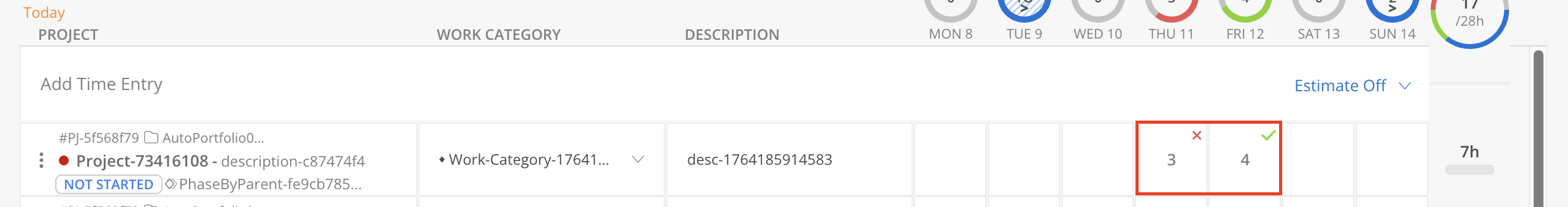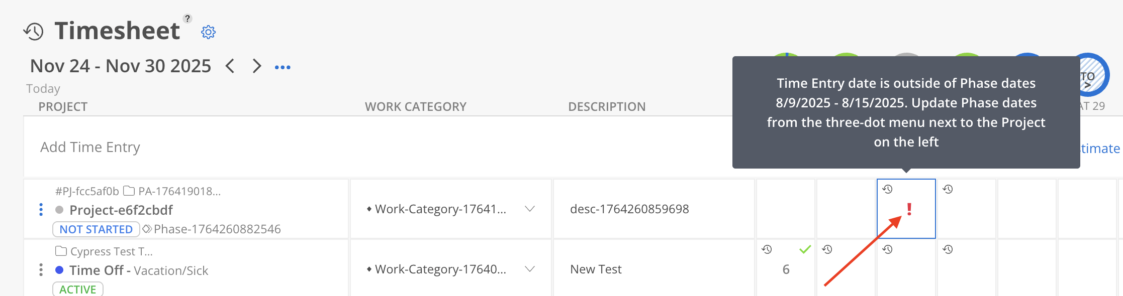 When entering hours in the Timesheets, the system automatically validates whether the Time Entry date falls within the defined Phase dates. If the entry date is outside the Phase's date range, the following indicators will appear: